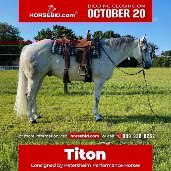 ♦️ 𝐭𝐡𝐞 𝐀𝐌𝐄𝐑𝐈𝐂𝐀𝐍 𝓕𝓪𝓵𝓵 𝓒𝓵𝓪𝓼𝓼𝓲𝓬 ♦️ Happening now thru MONDAY | OCTOBER 20th - Available EXCLUSIVELY on HorseBid's website! For more details and to register visit: www.Horsebid.com CONSIGNOR CONTACT: Petersheim Performance Horses 989-928-8262 LOCATION: Fowlerville, MI BREED: Quarter horse REGISTERED: Yes REGISTERED NAME: CLG LiL DUSTY BUENO COLOR: Grey HEIGHT: 15 AGE: 9 GENDER: Gelding CLG LIL DUSTY BUENO 2016 AQHA Foundation Bred Gray Gelding. If you're looking for a big tank of a gelding, look no further. Titan is a true all-around ranch horse. He has a heart of gold and the mind and ability to back it up. Take him on a cart ride down the road, use him to push and rope cattle, ride down the trail or take him to a ranch show. He has been used as a turnback horse and we use him to start/ ponying colts. Titan is the barn favorite and there isn't anything this horse won't do. He would make the perfect addition to any program. He stands 15 hands and is Solid, sane and sound. You won't find many like him. He loads, ties, clips and bathes with ease. Located in Fowlerville MI, for more information please contact Ora Petersheim at (989) 928-8262