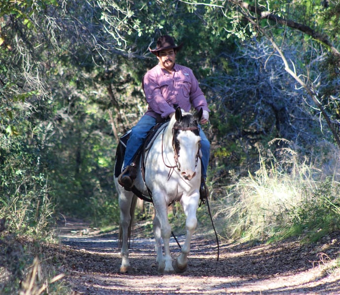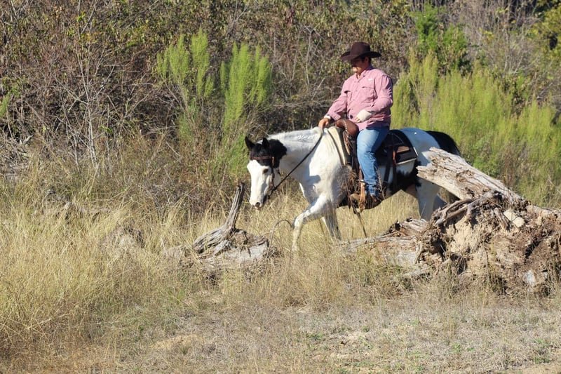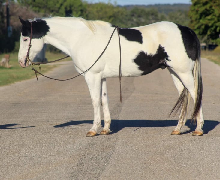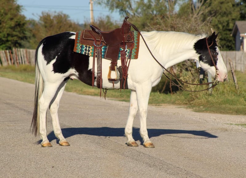 ONLINE AUCTION Place your bids at www.PlatinumEquineAuction.com Starting Bid $3500 Auction ends November 24th, 2024 Need a new saddle? Check out White Rock Saddles on our website or Facebook! Let me introduce to you this GORGEOUS one of a kind gelding known as Captain . He is a 8 year old black and white paint gelding standing 15hds tall. Captain is uniquely marked with blue eyes, a two tone black and white tail . This guy is GORGEOUS and is for sure going to get you noticed wherever you may take him. He has spent most of his young life on a ranch while doing all of the ranch chores , he has roped sick cattle outside, he has seen many many miles out on the ranch gathering and also checking fence. Captain has a awesome little lope to him and he will lope right out of your hand like butter , he is one handed broke, neck reins, moves off your leg , he will walk,trot and lope circles in the arena or out in the open field. He goes down the trail wherever you point him, ride him on the steep mountain trails or out in the flat grasslands he handles it all. Hes user friendly and isn’t complicated to ride at all. Captain is traffic broke he’s been rode down busy hwys, and also down at the Fort Worth Stockyards where he starred in a group of high schoolers school project , he was obviously the STAR of the show!!! And had great patience through it all. He has been rode in rodeo grand entry’s and parades. Everyone loves a gorgeous paint horse , I guarantee you won’t find another one like him!!! Captain will self load into the trailer, he stands tied with patience and no nonsense, stands for the farrier, and loves his bath time. Hes easy to tack up and bridle. Stands to be mounted and also stands for the mounting block. He can be turned out in a herd setting or stalled. Contact us to come try him, or we can set up a FaceTime also. If you need help with transport don’t hesitate to ask we have a list of reputable haulers that can get him safely to your doorstep world wide from Stephenville, TX. Contact M $ Performance Hores Michelle 661-817-9120 with any questions. ONLINE AUCTION Place your bids at www.PlatinumEquineAuction.com Starting Bid $3500 Auction ends November 24th, 2024 Need a new saddle? Check out White Rock Saddles on our website or Facebook!