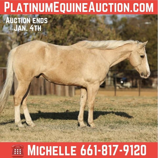 ONLINE AUCTION Place your bids at www.PlatinumEquineAuction.com Starting Bid $3500 Auction ends January 4th, 2025 Need a new saddle? Check out White Rock Saddles on our website or Facebook Two Smart Colossus “Sunny” — 2016 AQHA Palomino Gelding Standing 15.1 hands of pure class, Sunny is the kind you don’t just see — you remember. He’s a big, stout, old-school built gelding with a golden coat that shines like fresh desert sunrise. Grandson of Smart Little Lena, this is a horse bred with talent, brains, and presence. Sunny has been there and done that. A true seasoned ranch partner, he’s handled every outside job: gathering, sorting, long days checking cattle, dragging, doctoring — no surprises, no drama. He’s the horse you saddle when the work needs done right. He rides one-handed, soft, and correct. Smooth as silk at the walk, jog, or lope — he’ll tuck his head, stay collected, and lope slow circles all day long. Old soul, big heart, more whoa than go. He’s the gentleman that waits on you, not the horse you have to babysit. Sunny is traffic safe, flag-proof, balloon-proof, obstacle-tested and unfazed by chaos. Ride him alone down a country road or through the middle of town — the world can be loud and he stays quiet. He’s the horse everyone points at and whispers, “I want one like that.” He’s a beautiful mover, naturally balanced with a smooth stop and a classy turnaround. In the show pen he’s impressive. On the ranch he’s reliable. On the trails he’s a joy — bridges, water, logs, rough country — he simply walks through and gets it done. If you want a horse that brings big-time looks, honest broke ability, and family-friendly temperament, here he is. Sunny makes every ride feel like a good decision We are open to anyone interested in him to schedule a time to come see him or if you can’t make it schedule a FaceTime showing to see him. If you need help with transport don’t hesitate to ask we have a list of reputable haulers that can get him safely to your doorstep WORLD WIDE including, Alaska , Mexico, Hawaii, Canada and anywhere in between from Stephenville, TX. For more info contact Michelle with M $ Performance Horses 661-817-9120 ONLINE AUCTION Place your bids at www.PlatinumEquineAuction.com Starting Bid $3500 Auction ends January 4th, 2025 Need a new saddle? Check out White Rock Saddles on our website or Facebook