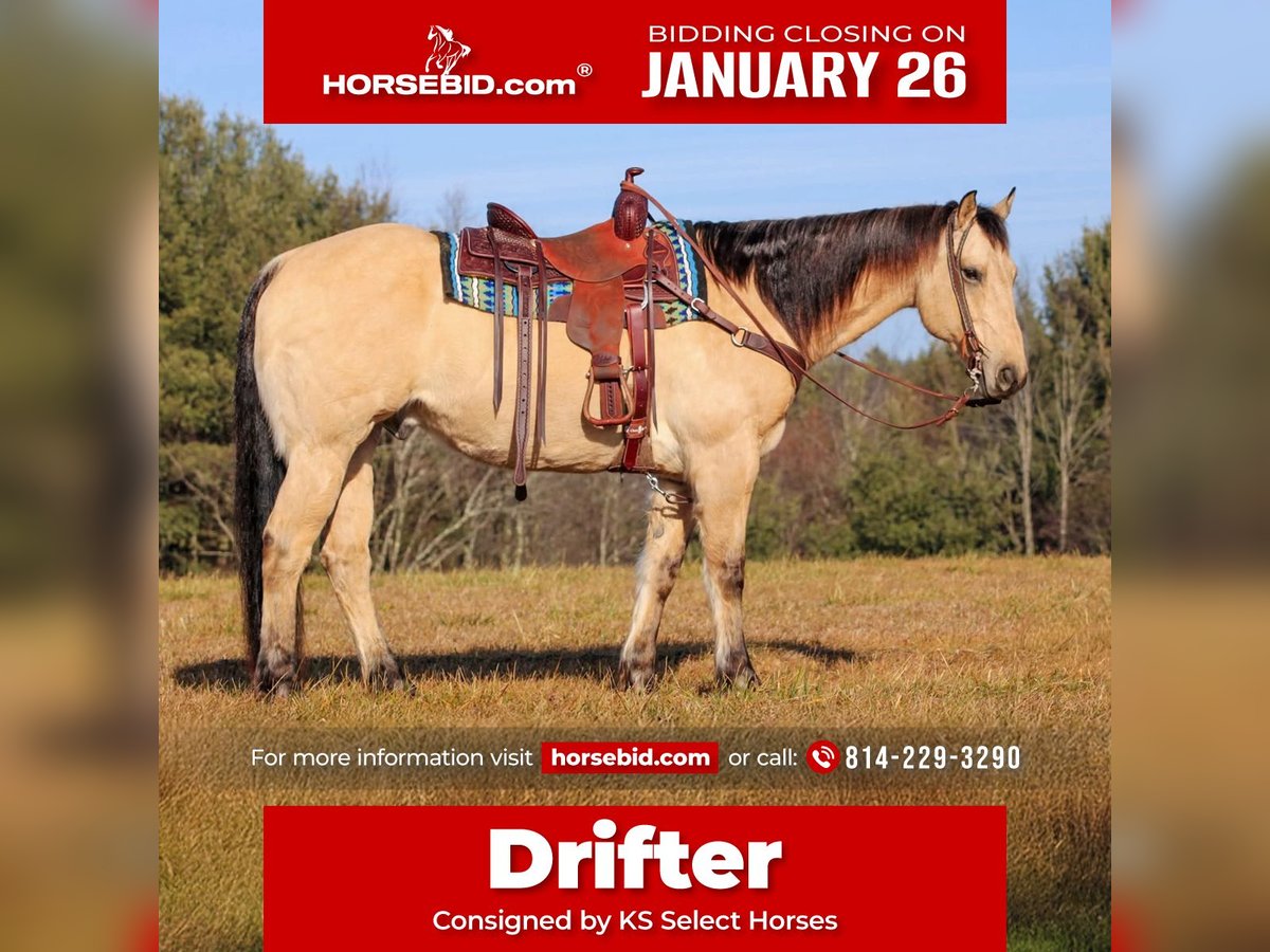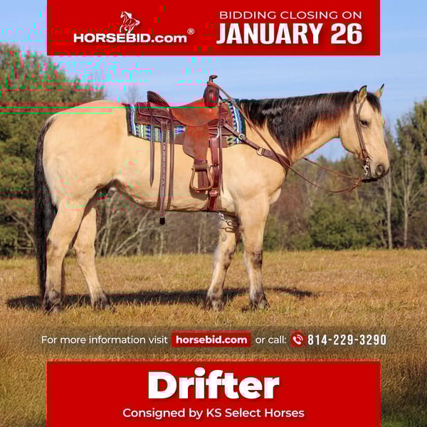 𝐉𝐀𝐍𝐔𝐀𝐑𝐘 ⭐️𝑨𝒍𝒍 𝑺𝒕𝒂𝒓 𝑳𝒊𝒏𝒆𝒖𝒑⭐️ Happening now thru MONDAY | JANUARY 26th - Available EXCLUSIVELY on HorseBid's website! For more details and to register visit: www.Horsebid.com CONSIGNOR CONTACT: KS Select Horses 814-229-3290 LOCATION: Clarion, PA BREED: Quarter Horse REGISTERED: Yes REGISTERED NAME: Drifter COLOR: Buckskin HEIGHT: 15.1 AGE: 10 GENDER: Gelding Drifter is a Registered 10 Year Old American Quarter Horse Gelding. I love his Buttermilk Buckskin color. He looks like Matt Dillon should be riding him in a older western movie! Wow Check Him Out! Drifter is the whole package! Perfect Age, Registered, Buckskin Color and Rides the Very Best and is Quiet and Gentle! He is a great trail horse that his been trail ridden all over. Goes anywhere you point him on the trail without hesitation. He is very sure footed in the rough terrain and is as good of a trail horse as you will find. Drifter has a good one hand neck rein, side pass, head set and back up. Drifter has been roped on and has done all types of ranch work and is very good when it comes to working with cattle. He also rides nicely in the arena with a smoot trot and lopes nice circles. You will love how easy and soft his neck rein is. Drifter is a easy horse to ride . Not complicated at all. Safe and Gentle each and every time you saddle him up to go enjoy a nice relaxing ride. Dont miss out on Drifter he is the whole complete package! On 1-14-26 Drifter had a complete Health Exam and passed everything with ease. We can help arrange delivery anywhere in the United States. Call or Text Kris at 814-229-3290. Thank You and God Bless