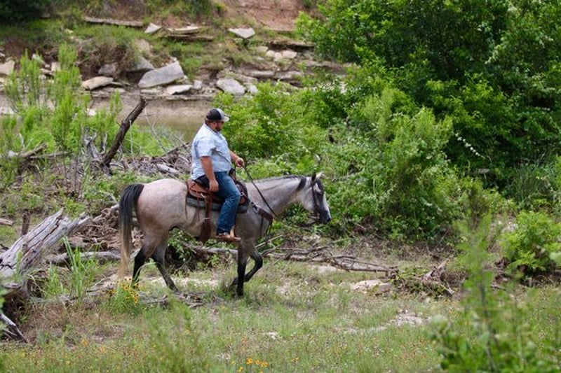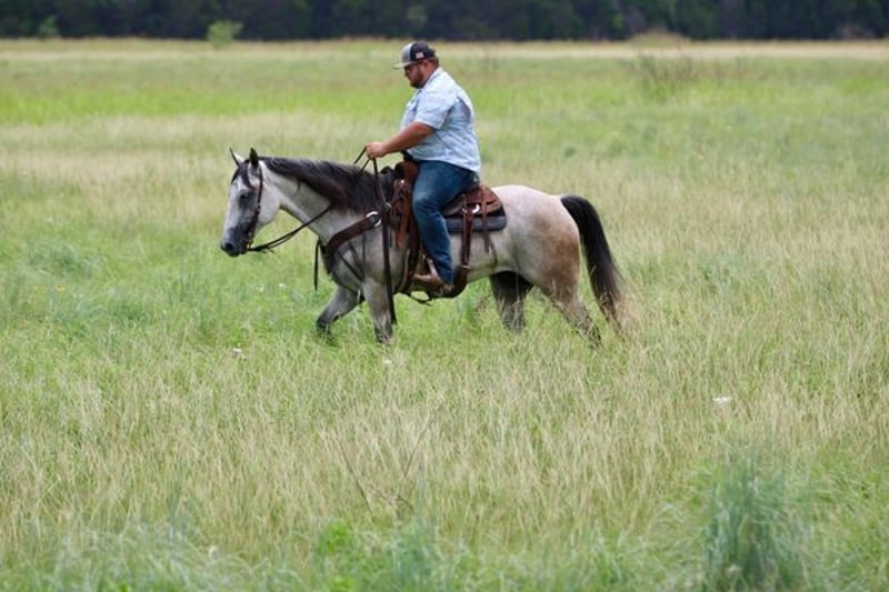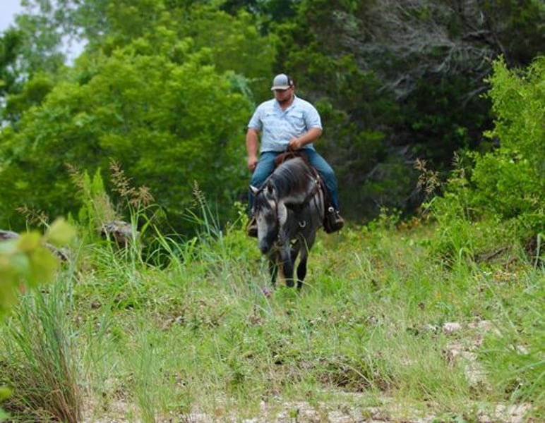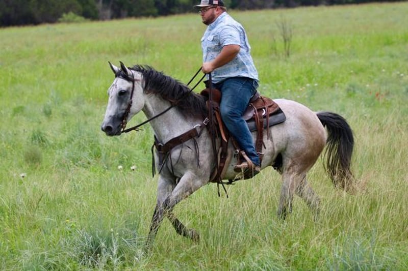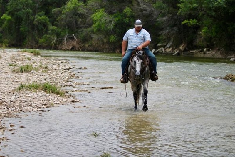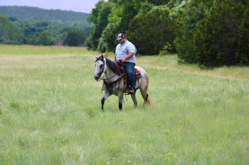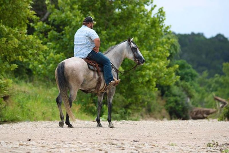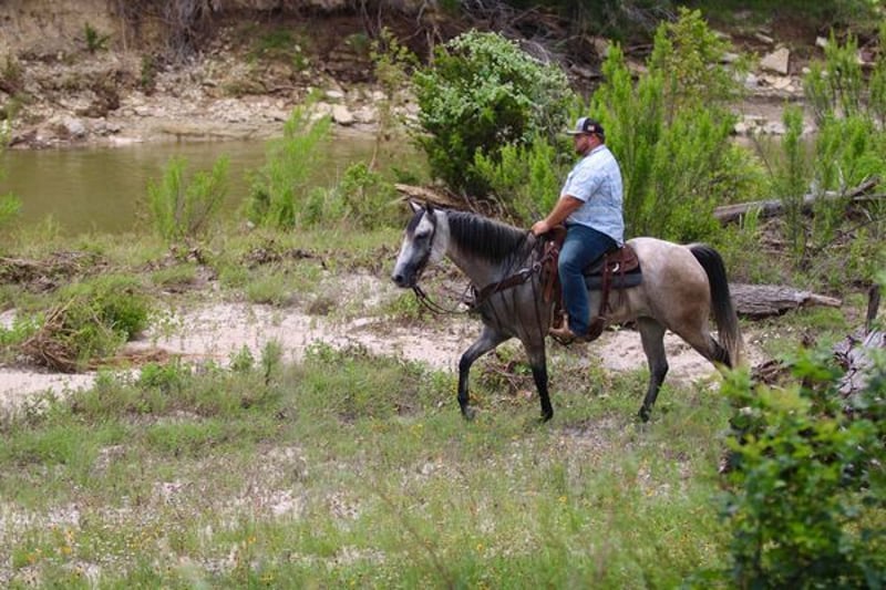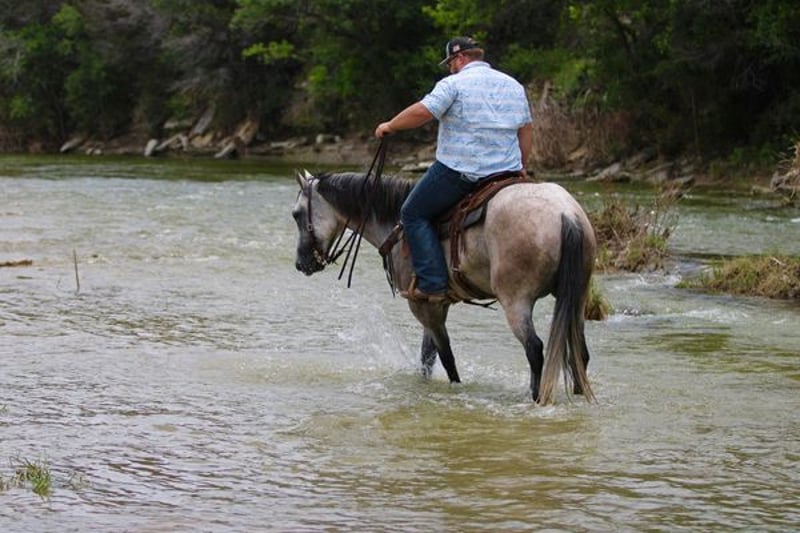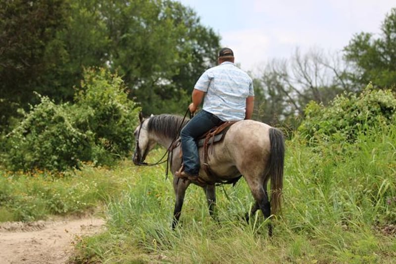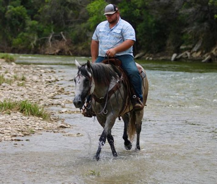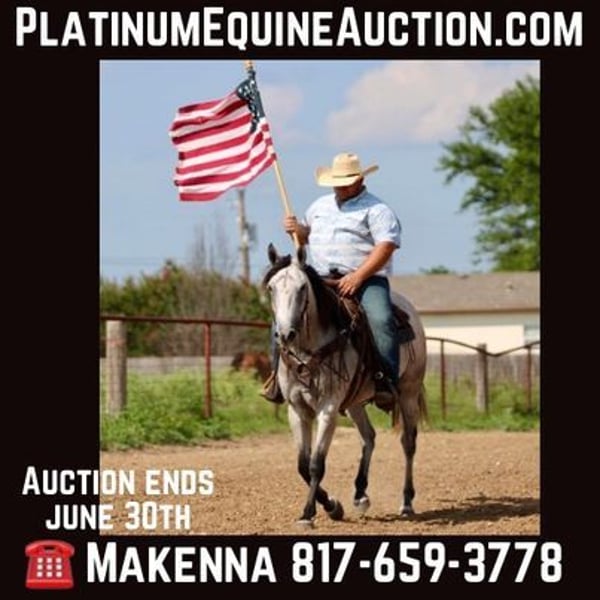 ONLINE AUCTION PLACE YOUR BIDS AT PLATINUMEQUINEAUCTION DOT COM $3500 STARTING BID AUCTION ENDS JUNE 30TH The first thing people notice about Aspen Air is that he’s gorgeous. He is shapey with a big soft kind eye and he has a cool ranchy look about him that always gets attention. He’s also a perfect size, easy to mount with great substance and presence, along with sturdy bone allowing him to go all day long. But Aspen is not just another pretty face. This guy does it all. He has been all over the country. As a result, Aspen has been exposed to everything under the sun. He ropes and holds cattle for doctoring; sorts and pushes cattle, gate sorts and moves pairs; and is slowly starting to come out of the box on the head side. With this horse and a good stock dog, you can load a pot full of cattle all by yourself. He is brave, confident, handy, and athletic. He’s also not all work and no play. Aspen has all the skills to be your best trail buddy or family horse. He will cross water, go over logs, through deep brush, and navigate bridges without having to ask him twice. He rides out alone or in a group with impeccable manners. He will tolerate any human shenanigans trail riding may bring out. In a saddle or bareback, he doesn’t care. Completely unbothered around dogs, vehicles, farm equipment and UTVs, even when they invade his personal space. He will pull your kids or grandkids around in a sled during winter or be their best riding mount. Aspen is a beautiful mover with easy transitions from walk-trot-lope/canter. Stops on a dime, has a cute turnaround on him. Broke like one should be. Loads and unloads without drama. You can pick up all 4 feet easily. Good in a stall or in a pasture with other horses. He stands 15.1hh tall and weighs 1200lbs and just 8 years old! Aspen has been 100% healthy, 100% sound and 100% sane. Be sure to check out his video. It is long, but worth the watch. This horse is one in a million and we want him to find a one in a million home! Located in Stephenville Texas We can help arrange hauling anywhere in the US, Hawaii or Canada! Please call or text Makenna Hartzel 817-659-3778.