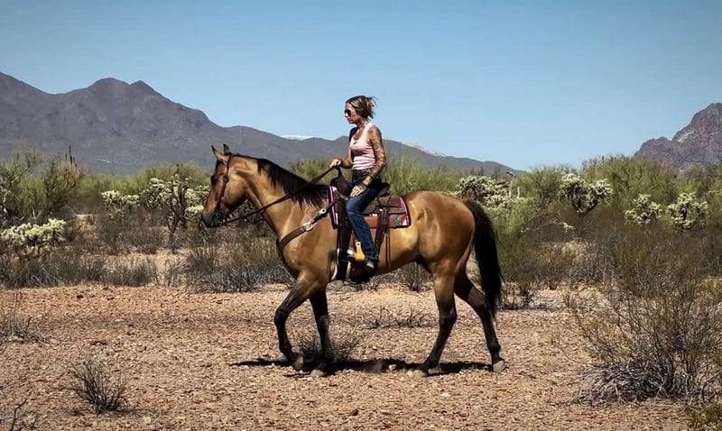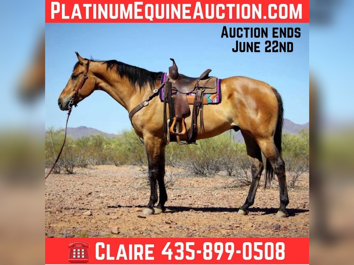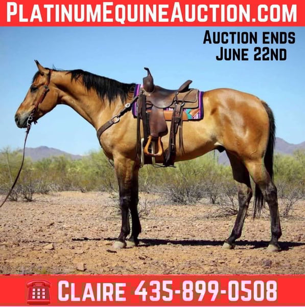 ONLINE AUCTION Place your bids at www.PlatinumEquineAuction.com Starting Bid $3500 Auction ends June 22nd, 2025 Need a new saddle? Check out White Rock Saddles on our website or Facebook! Meet Dino!! Gentle, broke and versatile all wrapped up in a pretty Dun package! Dino is a 9 year old, 16hh, grade quarter horse gelding that stands a full 16 hands tall. He has the most gorgeous dun coloring with a dorsal stripe and zebra leg markings. This guy will make you stand out in a crowd anywhere you take him! This gelding does a little of everything, but truly shines on the trails. He has been trail ridden alone and in groups, he prefers to lead but will follow along as well. He will cross brush and logs, water and has been exposed to dogs, bicycles, traffic and more. Not only is he sure footed and brave out on the trails, he is fancy and broke in the arena as well. He rides nicely one handed with a good neck rein, nice turn around, back up and even will ride around bridleless and bareback. On top of that Dino has been started riding English as well and will ride soft in your hands and move off leg well, he would be a great low level dressage prospect. He is a more woah than go horse, but he has also been pattered on barrels and poles, he may not win you a check but he will let you have fun! Dino has done lessons as well and has been ridden by all levels of riders. Dino has a very big, in your pocket personality! He is always wanting to know what you’re doing and join in with you. He is easy to catch, stands tied, bathes, good with his feet, loads and hauls well and gets along well with other horses. He is shod on all four and has great hard feet. Dino requires no maintenance. If you’re looking for a great, gentle all around type horse to enjoy on the trails and in the arena, this is your boy! Dino is located in Marana, Arizona. Please feel free to text or call Claire Siebols 435-899-0508 with any questions. ONLINE AUCTION Place your bids at www.PlatinumEquineAuction.com Starting Bid $3500 Auction ends June 22nd, 2025 Need a new saddle? Check out White Rock Saddles on our website or Facebook!