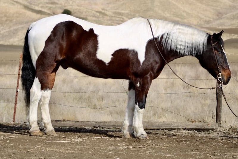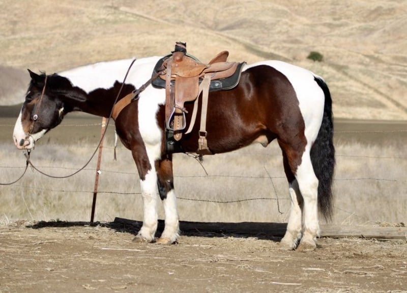 ONLINE AUCTION Place your bids at www.PlatinumEquineAuction.com Starting Bid $3500 Auction ends December 29th, 2024 Need a new saddle? Check out White Rock Saddles on our website or Facebook! Meet Bison… The gentle giant who will make your New Year unforgettable! This stunning 8-year-old tri color paint draft cross gelding is stunning with one blue eye standing at 16 hands, embodying strength and grace all wrapped up in one big puppy dog of a horse. Bison will greet you at the gate and put his nose in the halter he loves attention. Whether you’re gathering cattle or dragging calves to the fire or just enjoying a leisurely ride through picturesque state parks, he will calmly go out alone or with a groups of friends. He is great in the pasture with mares and geldings and is just as content in a stall setting. Bison is your go-to partner for any adventure. He calmly crosses flowing rivers and gracefully walks over downed trees while taking in the sights of wildlife with an air of confidence. With his impressive neck rein and sliding stop, this boy knows how to pick up leads like a pro in the arena making him perfect for riders from beginners to advanced he is a confidence builder. He’s also quite the star when it comes to parades, strutting his stuff like he owns the spotlight! But don’t let his good looks fool you; Bison has mastered obstacles too navigating bridges, car washes, and even tires with ease while looking effortlessly stylish whether dressed in English or Western tack. He has carried flags and is not bothered by tarps or balls he is just and easy going boy. He rides bareback in just a halter. You can stand on him slide off his butt and crawl all over him! Riding him feels like sinking into a plush couch; he’s as comfortable as they come! Plus, he’s easy to clip, show off at events or haul around town. He is not concerned about cars, semis or pedestrians. Bison tacks up easy stands for mounting and enjoys grooming sessions he is shod all the way around and good for the farrier. If you’ve been searching for that special equine companion who embodies both heart and versatility. Bison is waiting to meet you at Longhorn Ranch! Located in Paicines, CA contact Dina 831-537-1915. ONLINE AUCTION Place your bids at www.PlatinumEquineAuction.com Starting Bid $3500 Auction ends December 29th, 2024 Need a new saddle? Check out White Rock Saddles on our website or Facebook!