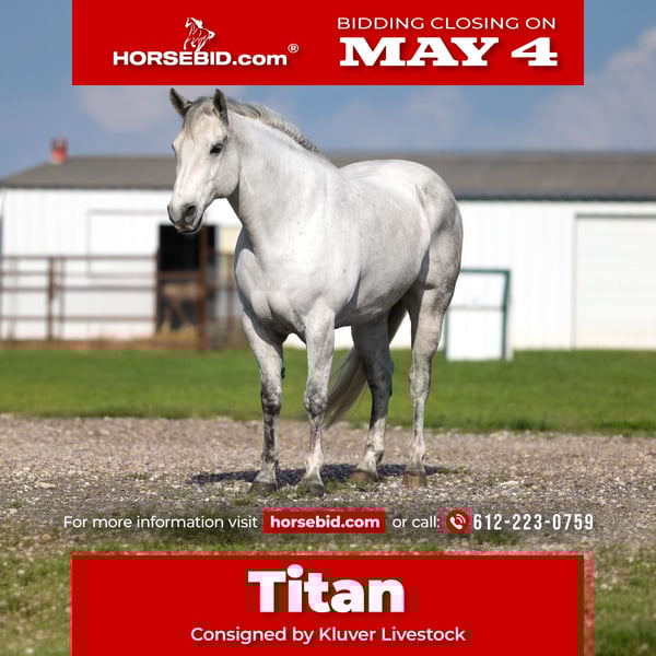 ▪️▫️◾️𝐭𝐡𝐞 𝑴𝒂𝒚 𝐒𝐞𝐥𝐞𝐜𝐭◾️▫️▪️ Happening now thru MONDAY | MAY 4th - Available EXCLUSIVELY on HorseBid's website! For more details and to register visit: www.Horsebid.com CONSIGNOR CONTACT: Kluver Livestock 612-223-0759 LOCATION: Ripley, OK BREED: QH REGISTERED: No COLOR: Grey HEIGHT: 15.2 AGE: 10 GENDER: Gelding Meet Titan the big boy who does it all! Titan is a 10 year old gelding standing at 15.2 hands weighing 1300 lbs. This gelding created the word stocky…with his big bones, thick neck, solid clean legs, and big hip! On top of being big and thick boned he’s a dappled grey! He will turn heads no matter where you are! Under saddle Titan has seen it all and has gone through it all. He’s a phenomenal trail horse who doesn’t bat an eye no matter what crosses the path whether it’s deer running across or a river he’s got to cross. He’s walked through brush, rivers, ditches, logs, muck, and anything that can come across one when out trail riding for miles. He’s been on multiple overnight trail rides and handles it great! He’s been used around the ranch checking fence and doctoring wheat cattle if needed. The whole family has used him for full days on the ranch from my 12 yr old brother to my grandma! He can be a very calm trail horse but can also leg up to keep up around the ranch! Titan is a very sweet gelding who is always looking for the next pat! He has a very calm demeanor no matter where he’s at or what he’s doing! On top of that he is a very easy keeper. He is truly a solid steady eddy!