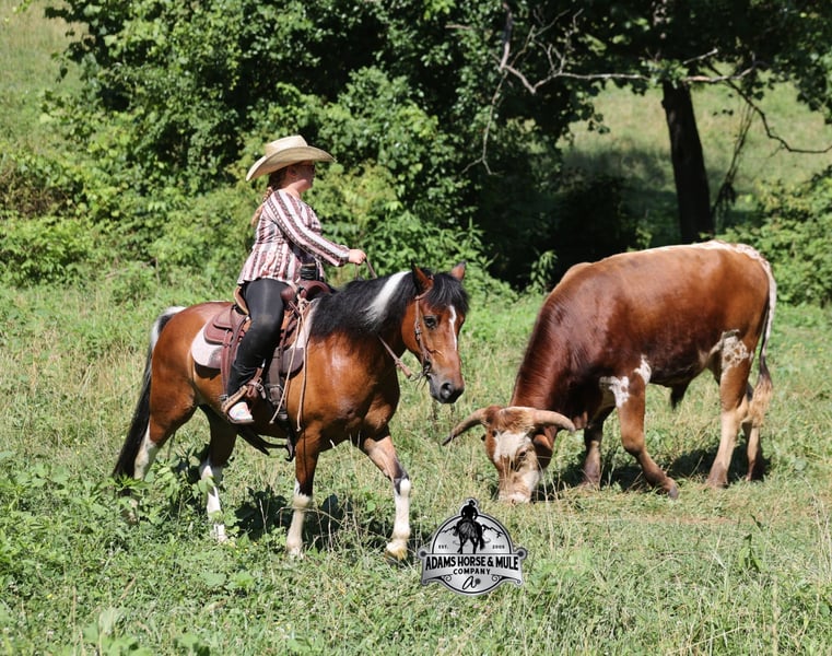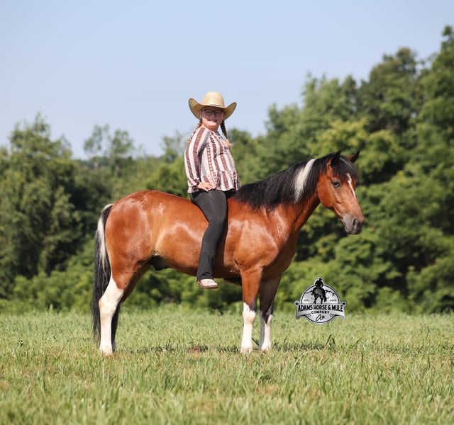 Snickers is consigned to the Best Of The West Horse Sale in Gladstone, NJ on September 26-27th. You can bid online or bid in person. There is a preview day before the sale or you can come ride him prior to the sale in Mt. Vernon, KY. Snickers is a 12.2h, stout built, 9 year old, paint quarter pony and he is sure you be your favorite little boy’s or little girl’s dream come to life! Snickers has been our little girl’s(Lynnlee) whole world for the last two years and now it’s time to move him along to another family and let him do his job of teaching some other kids how to ride while sitting them on the path of many years of success in the saddle. At 9 years old and 12.2hh he is the perfect age to have the experience and the perfect size to carry any size kid. Snickers is responsible for millions of smiles, thousands of giggles, and countless miles and hours of fun with our little girl… all while doing it flawlessly, completely safe and as close to perfection as a horse can get. Even early on before Snickers gave Lynnlee the confidence that she has now, Snickers would tolerate her mistakes with the reins, he would never take advantage of her and was very patient. Confidence comes easy with Snickers as he is one hand broke, he neckreins around and goes anywhere that you point him, he walks quietly but moves out when asked. He has a smooth trot, he lopes nice circles, always takes the correct leads and just floats along slow and easy while on a complete loose rein. Snickers can go English or Western. He has been over the rails and does it with ease. Snickers has been ridden through town, is traffic safe, around cows and down the trails. He is a trail riding machine and will take the little riders safely anywhere that the adults can go… creeks, ditches, crosses logs, picks his way through deadfall or rocky paths… he is very sure footed and is not in a hurry! Snickers will ride out alone, leave the barn behind with no issues, will ride in the front of a group or way back behind everyone without a fuss. Snickers is the same horse whether ridden daily or if he is left in the pasture for a few months during the winter. Snickers is very friendly and loves to be groomed, whether that is standing patiently for an hour so Lynnlee can braid every hair that he has or getting soaked with a hose and scrubbed with a half of a bottle of shampoo… Snickers is the perfect kid’s horse, with his patients, confidence, rideability… do your little one a favor and make sure that Snickers next home is with them! For more info call 606-308-2461.