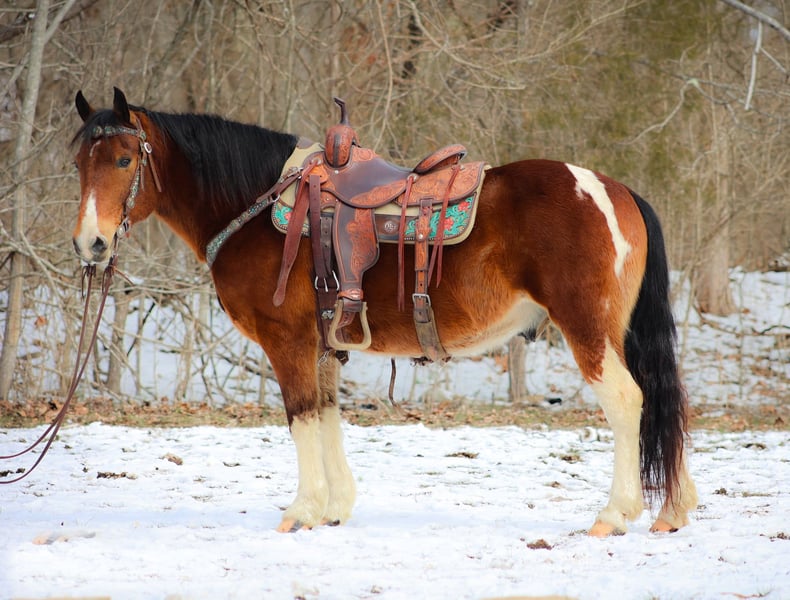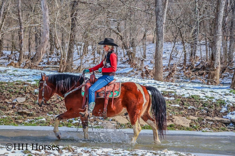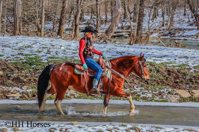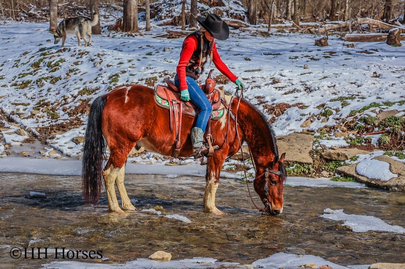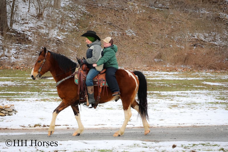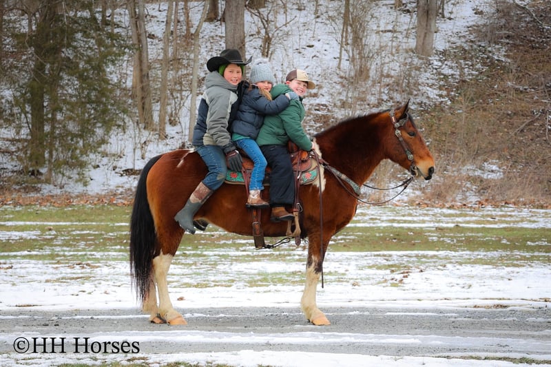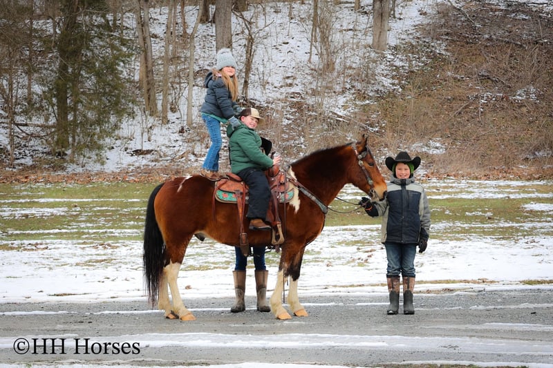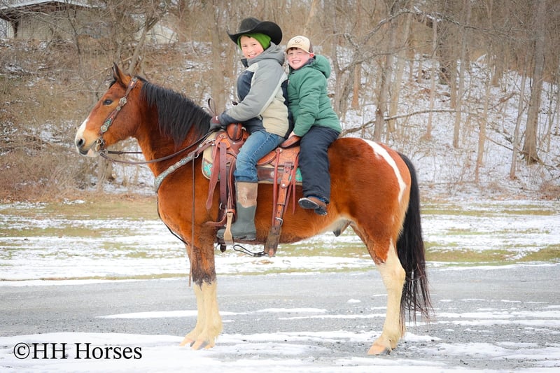 ONLINE AUCTION Place your bids at www.PlatinumEquineAuction.com Starting Bid $3500 Auction ends March 9th, 2025 Need a new saddle? Check out White Rock Saddles on our website or Facebook! This is “TOTANKA”, a super gentle, family friendly, and well trained BAY AND WHITE TOBIANO PAINT GELDING that is safe for the whole family. He has been ridden and shown by youth riders. He will lope nice circles, catch his leads, stop hard on whoa and back up. He willingly crosses streams and will travel over snowy and icy ground with confidence. This gelding will one step lope, one hand neck rein, and will not go any faster than asked of him. He rides double, triple, bareback, and in just a halter and lead rope. He loves attention, enjoys children, and is an easy keeper. He stands a stocky 14 hands tall and is 10 years old. He has excellent ground manners, can be handled by youth, and is also fine for novice and inexperienced adult riders. This gelding is stout enough to carry an adult rider and has good bone and feet. He is traffic safe, not spooky, and is a nice mover. He is the hard to find kind to come by. If you want a flashy family friendly paint gelding that the whole family can enjoy and love, don’t miss out. He has been around cattle and in the woods. If you’d like more info or want to make a Buy It Now Offer contact HH Horses Erin 304-238-4155 Located in Flemingsburg, KY. ONLINE AUCTION Place your bids at www.PlatinumEquineAuction.com Starting Bid $3500 Auction ends March 9th, 2025 Need a new saddle? Check out White Rock Saddles on our website or Facebook!