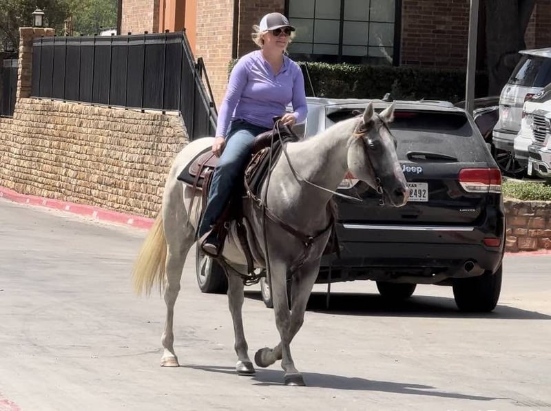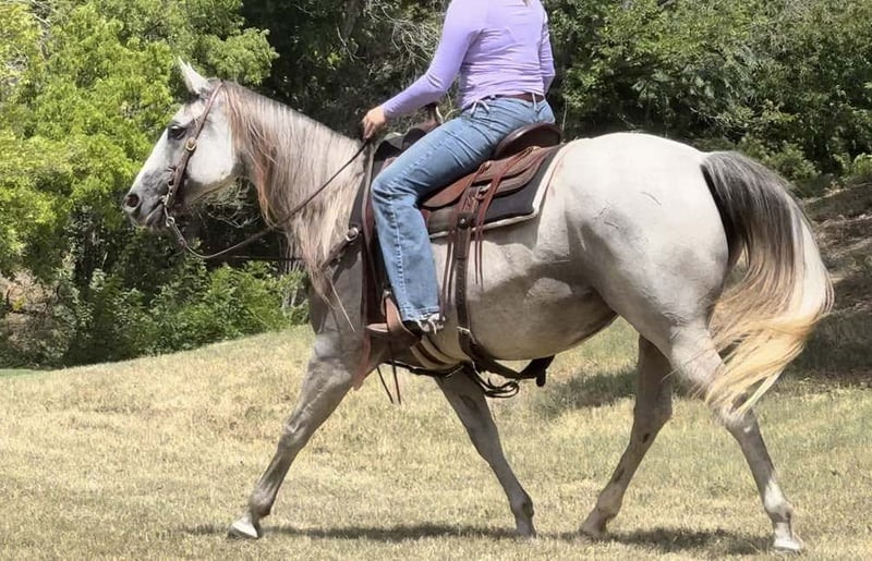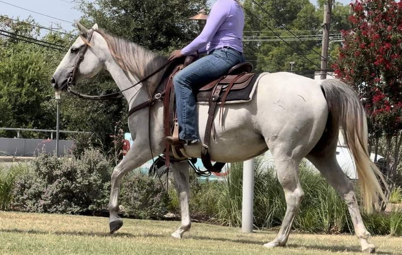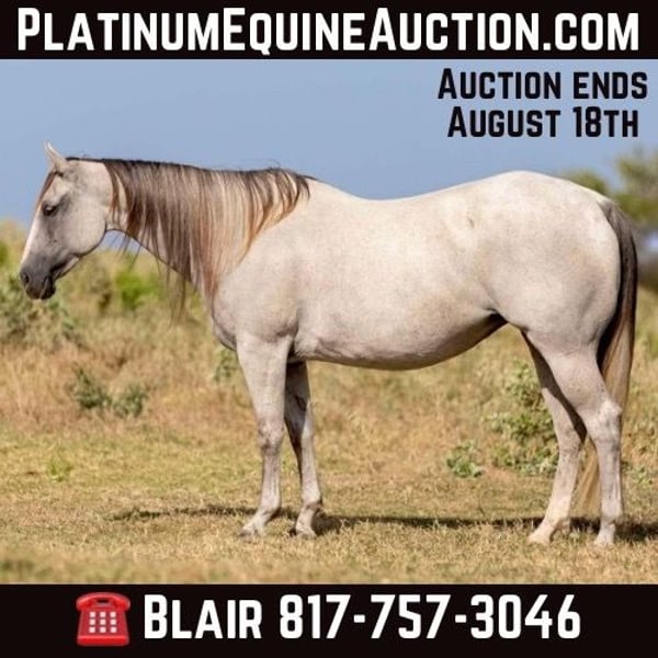ONLINE AUCTION Place your bids at www.PlatinumEquineAuction.com Starting Bid $3500 Auction ends August 18th, 2024 Need a new saddle? Check out White Rock Saddles on our website or Facebook! Abby is a 9 yr old 14.2H, gorgeous, stout gray QH mare. She is a laid back trail rider’s dream! If you’re looking for one that’s more whoa than go, and extremely gentle natured, don’t miss this girl! Abby has been used as a family trail horse, where mainly the 11 yr old novice rider used her. She’s been rode in town and on trails primarily. She is not spooky in the slightest and is very laid back. She is one of those horses you can haul alone without her going crazy in the trailer or while tied looking for a friend. She stands solid footed wherever you tie her and bathes like a statue. Abby has a GORGEOUS long mane and tail with red highlights and she definitely gets you noticed wherever you take her! She would be the perfect first horse for the little girl who wanted to crawl all over/under her, braid her hair and call her sprinkles. She’ll stand all day without a fuss and is absolute safe safe safe on the ground to be around the littles. Abby is a brick house and she’ll be able to handle most any size rider! Under saddle, she is very much a more whoa than go kind of gal. While you can absolutely get her to switch gaits, she won’t be one that trots/runs off with you ever! She stands solid as a rock to mount and NEVER will take a step until asked. She goes through water, over railroads and by cars without an issues. In the car world, she’s your Honda Civic, trusty and reliable but not going to win the Daytona 500. Abby is absolutely gentle all the way around and if you can walk a friendly dog, you’ll absolutely be comfortable with this mare. She’s also a comfortable horse to ride at all gaits. She’s best at direct reining but definitely will neck rein with leg pressure. Abby always stops exactly when you ask her to no matter how fast you’re going. She has one of the best, most laid back, gelding like personalities we’ve ever seen with a mare. She gets along with all other horses well and is a zero drama mare. She would excel as a trail horse, lesson horse for baby beginners, first kid horse, or first horse for a timid rider/horseman. She’s an incredibly easy keeper and stays fat on air. Abby is UTD on teeth and feed and is ready to go be her new person’s giant, respectful, quiet, easy going, melodramatic partner! Go to her website page northtexashorsecompany.com/abby for more pictures and footage! Please call Blair with North Texas Horse Company for more info at 817-757-3046. We are located in Weatherford, TX and can help arrange affordable shipping to anyone!! ONLINE AUCTION Place your bids at www.PlatinumEquineAuction.com Starting Bid $3500 Auction ends August 18th, 2024 Need a new saddle? Check out White Rock Saddles on our website or Facebook!
