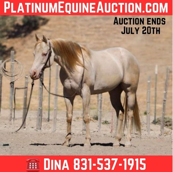 ONLINE AUCTION Place your bids at www.PlatinumEquineAuction.com Starting Bid $3500 Auction ends July 20th 2025 Need a new saddle? Check out White Rock Saddles on our website or Facebook Meet Argo – The Golden Gentleman You’ve Been Waiting For! Have you been searching for that super dependable horse—the kind that’s seen it all, been everywhere, and always keeps everyone safe? Well, guess what? Here he is! Argo is a unique and stunning champagne gelding who literally shines like gold in the sun. At 10 years old and standing 14.3 hands tall, he’s the kind of horse you can trust with anyone—from beginners to seasoned riders. He’s incredibly gentle, calm, and reliable. He’s been exposed to everything—water crossings, bridges, logs—you name it. Argo handles all trail obstacles like a pro: tires, walkovers, pool noodles, and more. He’s surefooted, confident, and willing to go anywhere you point him—alone or with a group. Argo has Been used in parades, rodeos and hauled to trail competitions. In the arena, Argo shines just as bright. He picks up his leads easily, has a smooth stop, soft back-up, and a fancy little turnaround that makes him fun to ride. His laid-back, cruiser-type personality comes with some cool buttons that make him a joy to pilot. And it gets better—traffic-safe as they come! Cars, trains, dogs, tractors—nothing fazes him. He’s been to the beach and loves the water. Argo’s also got real ranch experience. He’s been used for branding, sorting cattle, and ranch chores, and takes it all in stride. He’s easy to load, hauls great, tacks up without a fuss, and is farrier and vet approved. Always up to date on care, he travels well, and even handles time off like a champ. Located in Paicines, CA. Shipping available anywhere! If you’re looking for that once-in-a-lifetime kind of gelding, Argo is your guy. Contact Dina at Longhorn Ranch to learn more 831-537-1915 Located in Paicines CA. ONLINE AUCTION Place your bids at www.PlatinumEquineAuction.com Starting Bid $3500 Auction ends July 20th 2025 Need a new saddle? Check out White Rock Saddles on our website or Facebook