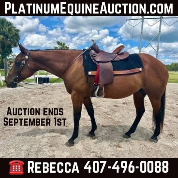 ONLINE AUCTION Place your bids at www.PlatinumEquineAuction.com Starting Bid $3500 Auction ends September 1st, 2024 Need a new saddle? Check out White Rock Saddles on our website or Facebook! Miss Pura Vida (pure life) is broodmare 9 years young standing 14.3hh. She is currently bred with a QH bay stud and due early 2025!!! She is level headed with a solid mind, enjoys being groomed and spending time with humans. She isn’t spooky, she has been handled on windy days and around dump trucks that don’t seem to phase her. With her temperament she would make a great recipient mare or broodmare. She has great ranch style breeding and would also be open to a job! She has been lightly started under saddle and ready to finish your way. She loads, ties, bathes and good for the vet. She still needs support for hoof trims on the hind, check out her awesome video!! It also contains footage on her trim (non-sedated) 8/10/24. She lunges on a line and has good coordination over ground poles. Very willing and want to please. When you come to the barn she will say hello with a neigh and whinny especially if you have a treat. Overall she is an absolute sweetheart and hope to find her an amazing family! She is utd on all shots & coggins. She is Barefoot and sound. Contact Rebecca Rodriguez 407-496-0088 with any questions. Located in Christmas, FL. ONLINE AUCTION Place your bids at www.PlatinumEquineAuction.com Starting Bid $3500 Auction ends September 1st, 2024 Need a new saddle? Check out White Rock Saddles on our website or Facebook!