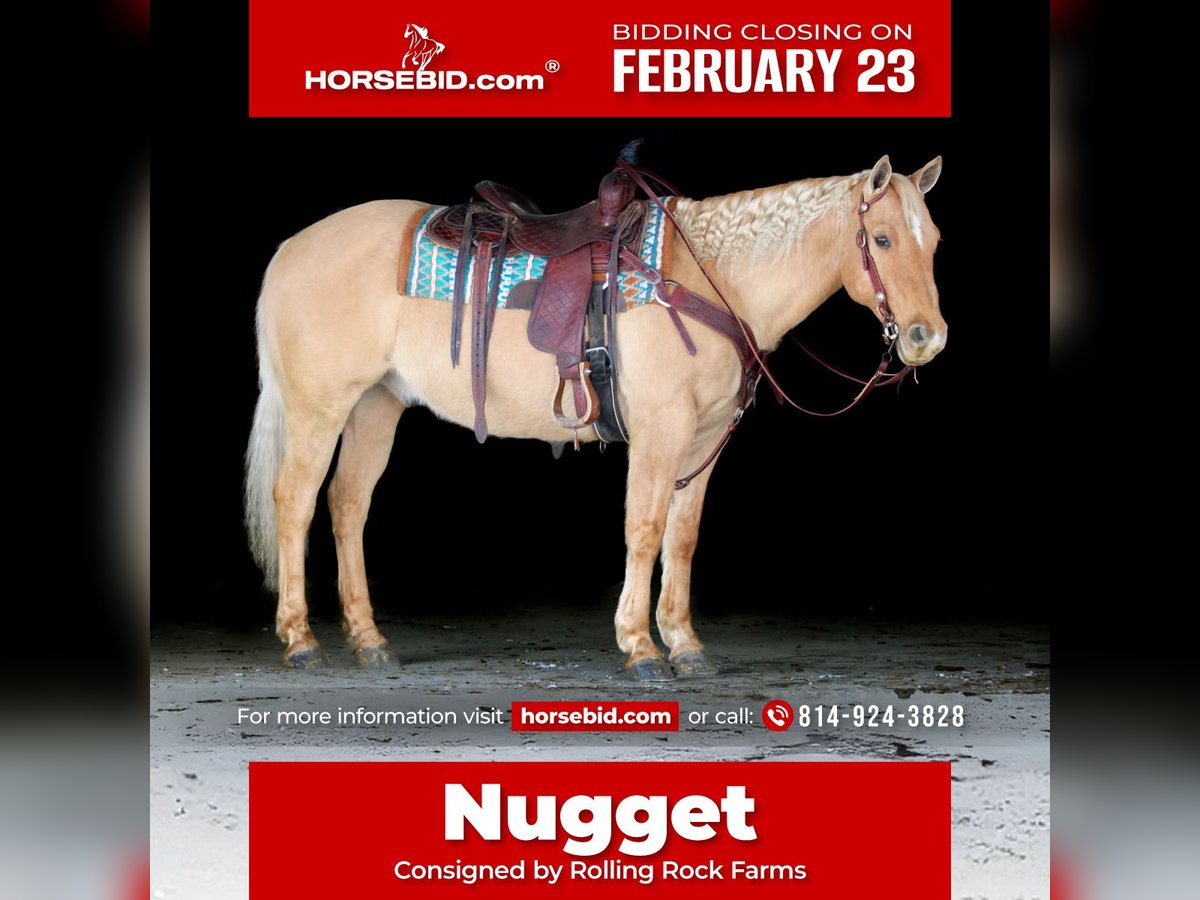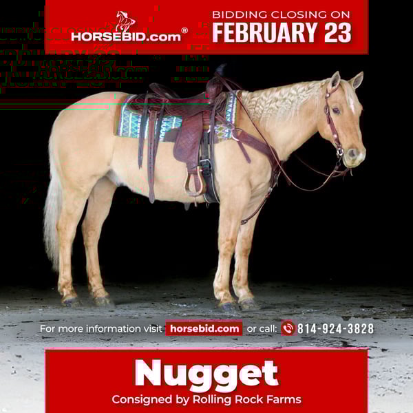 💎 𝐓𝐇𝐄 𝓓𝓲𝓪𝓶𝓸𝓷𝓭 𝐒𝐇𝐎𝐖𝐂𝐀𝐒𝐄 💎 Happening now thru MONDAY | FEBRUARY 23rd - Available EXCLUSIVELY on HorseBid's website! For more details and to register visit: www.Horsebid.com CONSIGNOR CONTACT: Rolling Rock Farms 814-924-3828 LOCATION: Miola, PA BREED: Quarter Horse REGISTERED: No REGISTERED NAME: Nugget COLOR: Palomino HEIGHT: 14.3 AGE: 11 GENDER: Gelding Nugget is an 11 year old 14.3 hand palomino gelding that is very good looking and easy going. He is kid safe and suitable for a youth or novice rider, with a steady mindset that makes him dependable and enjoyable to be around and ride. In the arena, Nugget rides around the way a horse should. He neck reins one handed, will pivot correctly, and rides through a correct circle. He carries a nice headset at the trot and lopes even, balanced circles. He will pick up both leads at the lope without issue and stays consistent in his transitions. He side passes to open and shut gates with ease and is responsive without being overly sensitive. Outside of the arena he is broke enough to ride bridleless and stays relaxed and willing. Nugget is trained to carry the American flag and will also pull a sled. He has been exposed to a variety of situations and handles them quietly. On the trail he is confident and steady. He will go out alone or in a group setting and is comfortable on different types of terrain. He crosses water, steps over logs, and travels through uneven ground without hesitation. He is good around dogs, livestock, and other animals. Around the barn Nugget is easy to manage. He can live out in the pasture or stay in a stall and settles in well either way. He is lower in the pecking order and gets along well with other horses. He loads easily, hauls well, and stands tied and in cross ties. He stands for brushing, tacking, bathing, and is good for the farrier. He is also good around kids and is respectful on the ground. Nugget sells with a current negative Coggins and an up to date rabies vaccination. He passed a health and wellness exam on 2/9/2026. He is a versatile gelding that is easy to get along with and ready to go on and do someone’s job whether that is arena work, trail riding, or being a dependable mount for a youth or novice rider.