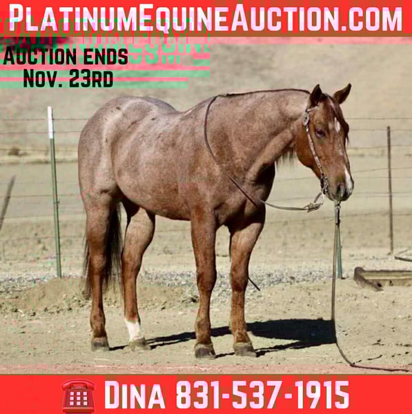 ONLINE AUCTION Place your bids at www.PlatinumEquineAuction.com Starting Bid $3500 Auction ends November 23rd, 2025 Need a new saddle? Check out White Rock Saddles on our website or Facebook Bugatti – Beautiful, Fancy, Fun, and Unflappable Meet Bugatti, the stunning red roan gelding who defines cool confidence. At 10 years old and standing 14.3 hands, this handsome gentleman is the perfect blend of style, steadiness, and class — the kind you can enjoy every single day and still be proud to show off anywhere you go. Bugatti is the real deal: fancy broke, soft in the bridle, and smooth through every transition. He’s got a stylish turnaround, a clean stop, and carries himself with that natural presence that makes every ride look effortless. He’s been roped on, gathered cattle, and handled all kinds of ranch work, taking each task in stride with that calm, collected attitude that’s hard to find. He’s also been hauled on camping trips and ridden across all kinds of country — from the Redwoods to the Sierras — and he takes new places like he’s been there a hundred times. Whether you’re cruising the arena, checking fence, or hitting the mountain trails, he moves with quiet willingness and that touch of class that makes him stand out everywhere he goes. When it comes to the real-world stuff, Bugatti checks every box — flags, tarps, dogs, traffic, strollers, bridges, and water crossings don’t bother him a bit. He’s been around it all and handles everything with that same easy, level-headed attitude. He’s one of the easiest horses you’ll ever meet — honest, forgiving, and steady for any rider. He ties, clips, bathes, loads, and hauls like a pro, and stands polite for the vet and farrier. Whether he’s in a stall or turned out, Bugatti stays the same — quiet, gentle, and ready to please. With that deep red roan coat, good bone, and kind, intelligent eye, Bugatti isn’t just another horse — he’s a statement. Classy enough for the arena, confident enough for the ranch, and kind enough for the whole family. If you’ve been searching for one that’s handsome, dependable, and game for anything, Bugatti is your total package — the kind that makes every ride feel easy. 📍 Located at Longhorn Ranch – Paicines, California 📞 Contact: Dina 831-537-1915 Shipping available nationwide ONLINE AUCTION Place your bids at www.PlatinumEquineAuction.com Starting Bid $3500 Auction ends November 23rd, 2025 Need a new saddle? Check out White Rock Saddles on our website or Facebook
