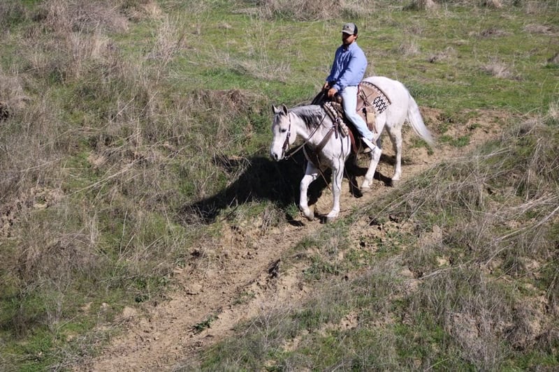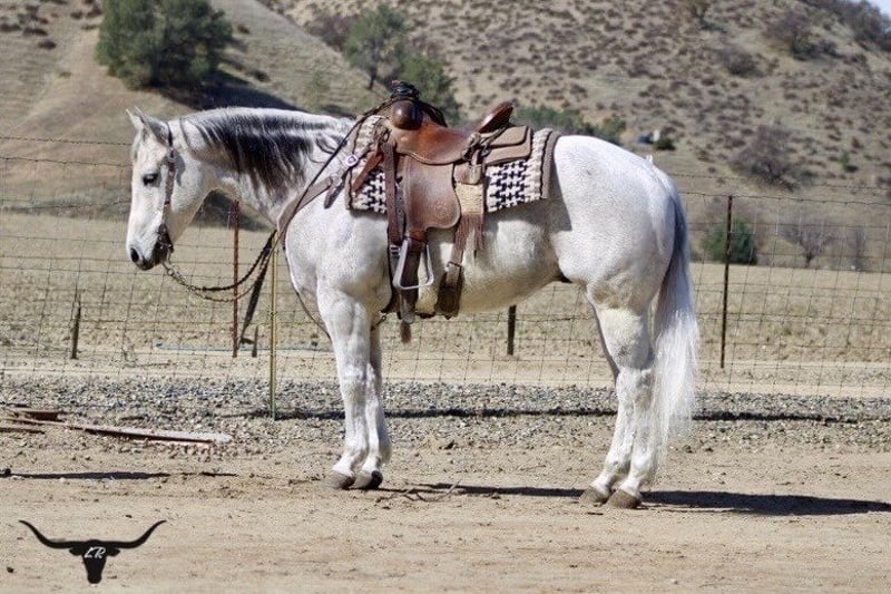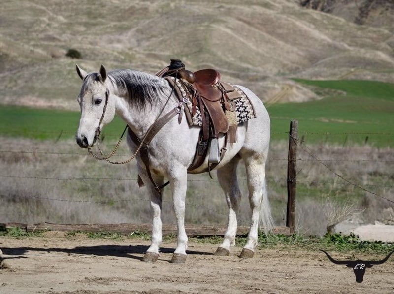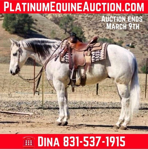 ONLINE AUCTION Place your bids at www.PlatinumEquineAuction.com Starting Bid $3500 Auction ends March 9th, 2025 Need a new saddle? Check out White Rock Saddles on our website or Facebook! Benz – he totally lives up to his name! This guy is all about luxury, comfort, and style. Standing at 14.3 hands he’s a stunning 10-year-old dapple grey beauty that is the perfect size and maturity. He’s got a resume that would impress anyone, from ranch duties to rodeos, and he’s the perfect family horse or trail buddy. Benz is super well-trained; he spins, slides, and has the smoothest transitions in his gaits that makes him just a joy to ride. You can trust him completely! He can chase down a cow or take you on a tranquil trail ride. He’s the most reliable and safe horse you could ever hop on. He can side pass, pivot, and has this rocking chair lope that you could sit on for hours. He’s easy to catch, great for the farrier and vet, and loads and unloads like a champ. He stands tied, and saddling and bridling him is a breeze. He is comfortable in a stall or pasture setting. Benz has gathered cattle in tough terrain and will cross anything – brush, downed trees, and even the deepest water without a fuss. No matter how much time passes, he’s always the same reliable horse. He’s been ridden through busy streets, carried flags, and doesn’t bat an eye at tarps or balls. Whether you’re a cowboy, a seasoned trail connoisseur or just someone looking for a leisurely ride, Benz is your guy. His gentle nature makes him perfect for families with riders of different abilities. This easy-going gelding is such a asset to have around, and he’s in the prime of his life with so much knowledge to share. He has no vices he’s solid, sane, and super smart. We’ve loved every moment with this beautiful gelding, and he’s definitely going to be missed. I can’t imagine anyone not falling in love with his friendly disposition! If you’re interested, feel free to reach out to Longhorn Ranch and set up a time to meet him. You can contact Dina at 831-537-1915. He’s located in Paicines, CA. Trust me, you’re going to love him! ONLINE AUCTION Place your bids at www.PlatinumEquineAuction.com Starting Bid $3500 Auction ends March 9th, 2025 Need a new saddle? Check out White Rock Saddles on our website or Facebook!