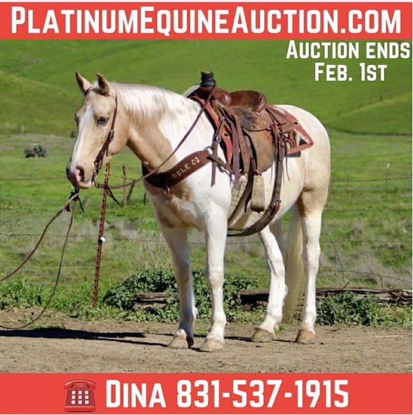 ONLINE AUCTION Place your bids at www.PlatinumEquineAuction.com Starting Bid $3500 Auction ends February 1st, 2026 Need a new saddle? Check out White Rock Saddles on our website or Facebook 11-Year-Old Palomino & White Gelding • 14.3 Hands Some horses come with a long list of rules. Clint did not get that memo. He’s the kind that makes riding feel easy, relaxed, and enjoyable—no negotiations required. Swing a leg over, point him where you’d like to go, and he’s happy to oblige. Clint has a quiet, willing demeanor and a good sense about him. He’s the type that keeps things calm and doesn’t feel the need to add drama to your ride. If you’re looking for a horse that prefers doing his job over making a scene, Clint fits the bill. In the arena, Clint keeps things smooth and uncomplicated. He walks, trots, and lopes with an easy rhythm, picks up his leads, stops off your seat, and backs willingly. He neck reins nicely, stays light in the bridle, and doesn’t require micromanaging to ride well. Outside the arena is where Clint really earns his keep. He’s sure-footed on the trail, handles hills, brush, and water crossings, and approaches new scenery like he’s seen it before (even when he hasn’t). He’s been around flags, tarps, balls, bridges, pool noodles, traffic, dogs, and farm equipment and treats them all like background noise. He’s also been around cattle and has been roping the lead steer without any objections. On the ground, Clint is just as agreeable. He tacks up quietly, stands to be groomed, loads and hauls well, and is great for the farrier. He does well in a stall or pasture and rides out alone or in a group without fuss. If you’re searching for a good-looking gelding that keeps life simple and rides the way a horse should, Clint checks a lot of boxes—and probably a few you didn’t know you had. Clint is a fun and playful gelding ready to be your new best friend. Dina – Longhorn Ranch Paicines, CA 831-537-1915 Nationwide shipping available with reputable haulers ONLINE AUCTION Place your bids at www.PlatinumEquineAuction.com Starting Bid $3500 Auction ends February 1st, 2026 Need a new saddle? Check out White Rock Saddles on our website or Facebook