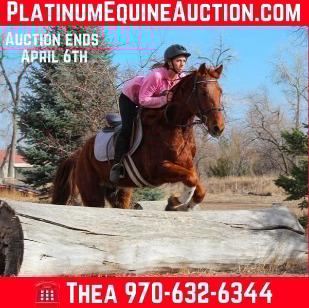 ONLINE AUCTION Place your bids at www.PlatinumEquineAuction.com Starting Bid $3500 Auction ends April 6th, 2025 Need a new saddle? Check out White Rock Saddles on our website or Facebook! Pumpkin is a 10-year-old, 15-hand gelding with a heart of gold! This sweet and affectionate boy adores people and has exceptional ground manners. He self-loads, backs out of the trailer with ease, and will stand tied all day without a fuss. He loves being bathed, is fantastic for both the vet and farrier, and has been barefoot his whole life! In the herd, Pumpkin is an easygoing, low-ranking horse who gets along with everyone—horses and livestock alike. Pumpkin is truly versatile, riding both English and Western with confidence. He looks absolutely adorable in an English saddle, knows his collection and leads, and is currently working on flying changes and cross rails. He’ll trot around on a loose rein, pick up a lope off a simple cluck or kiss, and will stop just from your voice. He also has a neck rein! When it comes to trail riding, Pumpkin is a total star! He’s surefooted and brave, handling rugged terrain with ease. Traffic, commotion, and new environments don’t phase him—he’s even been ridden through the drive-thru! Whether you’re looking for a reliable trail companion, a fun arena horse, or a laid-back partner with a big personality, Pumpkin is as solid as they come. Pumpkin does require light maintenance for one stifle if you are wanting to do strenuous work although he is just fine to trail ride and jump on as seen in his video with no maintenance. Check out his video to see just how special and versatile this guy truly is! Located in Fort Collins, CO. Contact Thea with Dynamite Horses 970-632-6344 ONLINE AUCTION Place your bids at www.PlatinumEquineAuction.com Starting Bid $3500 Auction ends April 6th, 2025 Need a new saddle? Check out White Rock Saddles on our website or Facebook!