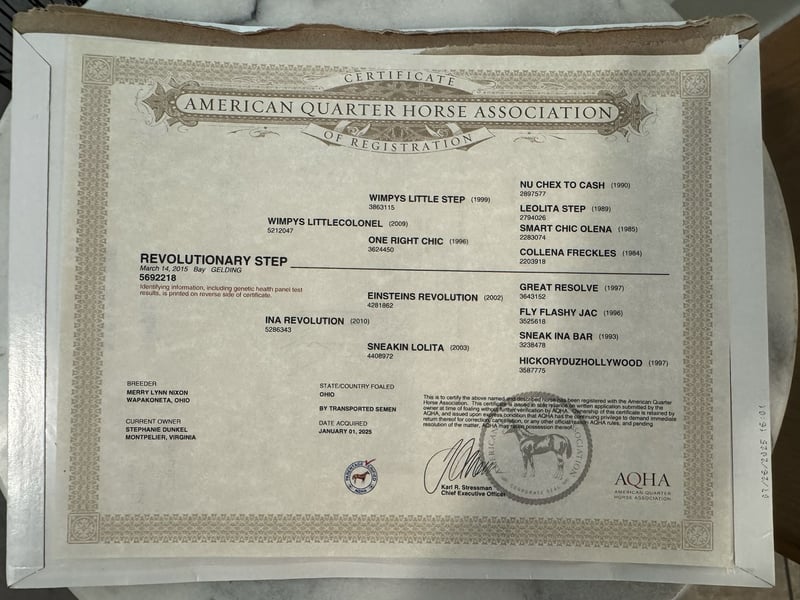ONLINE AUCTION Place your bids at www.PlatinumEquineAuction.com Starting Bid $3500 Auction ends February 1st, 2026 Need a new saddle? Check out White Rock Saddles on our website or Facebook Revolutionary Step is an 11-year-old gelding that checks all the boxes for someone looking for a dependable, all-around ranch and trail horse with proven ability. He has earned NRHA money, bringing solid training and body control, but truly shines as a versatile, user-friendly mount. He’s exceptional on the trail—quiet, sure-footed, and confident in new environments. Crosses water, handles uneven terrain, and stays calm whether riding alone or in a group. On the ranch, he’s comfortable around cattle, making him a great fit for ranch riding, sorting, and day-to-day ranch work. Revolutionary Step has a great mind, smooth gaits, and a willing attitude, making him suitable for long days in the saddle or relaxed rides down the trail. He’s the kind of horse you can ride during the week and enjoy on the weekend without needing to tune him up every ride. ✔ 11-year-old gelding ✔ NRHA money earner ✔ Quiet, reliable trail horse ✔ Confident around cattle ✔ Ranch riding ready ✔ Extremely versatile and user-friendly If you’re looking for a solid, honest horse that’s been there and done that—Revolutionary Step is ready to go to work or hit the trail. Located in Providence Forge, VA. For more info contact Andre Andraos 949-292-6914 ONLINE AUCTION Place your bids at www.PlatinumEquineAuction.com Starting Bid $3500 Auction ends February 1st, 2026 Need a new saddle? Check out White Rock Saddles on our website or Facebook