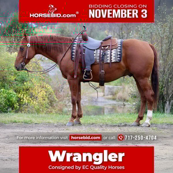 ⚜️𝐓𝐇𝐄 𝐅𝐀𝐋𝐋 𝐇𝐄𝐑𝐈𝐓𝐀𝐆𝐄 𝐂𝐋𝐀𝐒𝐒𝐈𝐂⚜️ Happening now thru MONDAY | NOVEMBER 3rd - Available EXCLUSIVELY on HorseBid's website! For more details and to register visit: www.Horsebid.com CONSIGNOR CONTACT: EC Quality Horses Carley 717-250-4704 LOCATION: Beaver Springs, Pa BREED: Quarter Horse REGISTERED: Yes REGISTERED NAME: DAN YELL BOON COLOR: Sorrel HEIGHT: 15.1 AGE: 10 GENDER: Gelding “DAN YELL BOON” aka Wrangler is 2015 model (10yr old) Sorrel Gelding. Wrangler stands approximately 15.1hh tall he has a good build and a solid confirmation. Looking for a horse that is versatile, confident, and reliable look no further! Wrangler is an easy ride. He rides great in the arena. He will walk, trot, and canter. He will one hand neck rein, backup, and side pass. He is soft in the bridle and rides off collected. He is super super broke and very fun to ride! Wrangler is super cowy. He would excel well in the ranch sortings or team pennings. Wrangler would also make a super nice all around working western, ranch pleasure, english equitation, or just a solid trail horse! We have trail ridden Wrangler all over the place. He has seen different types of terrain. He is the kind that is point and go. He will cross over logs and go through water. Wrangler is gentle and honest. He great in a mixed herd. He is easy to catch. Wrangler stands to get saddled, unsaddled, mounted, and dismounted from. Wrangler also stands great for the farrier and vet. He has a good disposition and is always a gentleman to be around. He loads and unloads on and off the trailer. Wrangler is selling 100% sound and sane, with NO vices! Wrangler will come with a current coggins and health certificate after purchase! If you have any questions or would like more information regarding Wrangler please don’t hesitate to reach out to Carley @ 717-250-4704 i’d be happy to help!