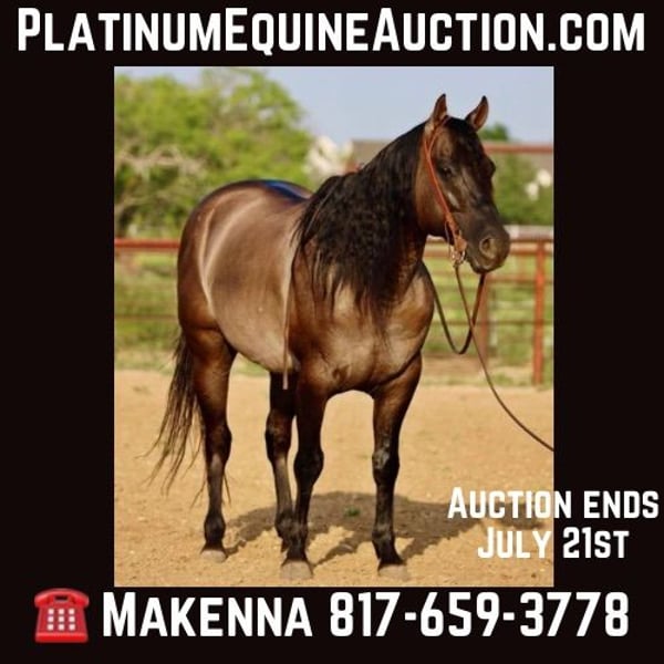 ONLINE AUCTION Place your bids at www.PlatinumEquineAuction.com Starting Bid $3500 Auction ends July 21st, 2024 Need a new saddle? Check out White Rock Saddles on our website or Facebook! Check out this gelding that will turn heads anywhere you go. Chapo is a registered 9 year old gorgeous grulla with the all shape you want. He stands 15.1 weighs 1200lbs. He was bred by the world renowned, Shining C Grulla Horses! Chapo is a beautiful mover and could truly go any direction, western or English. He is strong and willing and GENTLE! He is a been there done that kind of gelding, the kind you can ride BRIDLESS through a parade with hundreds of people around!! Loud noises, traffic, people, busy streets and flags everywhere never once phased him! Take him through any kind of country or terrain you want he won’t skip a beat. If you want a horse that’ll be the same every time he’s your guy. Go check your cows on him or have a a nice relaxing day with him on the trails. He will last as long as you need him to at the speed of your choice. Chapo has been used to rope cattle outside and started on slow cattle in the arena! He stands tied for baths and for the farrier with no problems. Chapo enjoys a good day on the trails. He lopes nicely both ways with a big floaty trot. Chapo will cross any obstacle in front of him. We can help arrange delivery to any where in the United States, even Hawaii and Canada as well. Our ranch is located in Stephenville, TX. Contact Makenna Hartzel 817-659-3778 with any questions. ONLINE AUCTION Place your bids at www.PlatinumEquineAuction.com Starting Bid $3500 Auction ends July 21st, 2024 Need a new saddle? Check out White Rock Saddles on our website or Facebook!