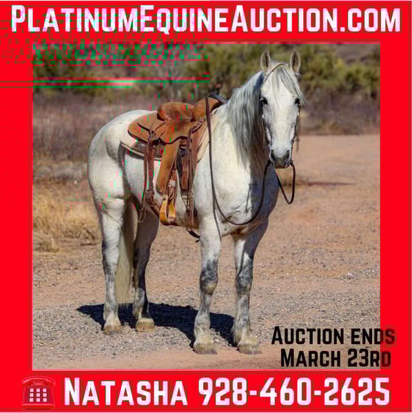 ONLINE AUCTION Place your bids at www.PlatinumEquineAuction.com Starting Bid $3500 Auction ends March 23rd, 2025 Need a new saddle? Check out White Rock Saddles on our website or Facebook! Gandalf is a 10 year old grade warlander gelding standing 15.1hh. This magnificent gelding is just as gentle as he is gorgeous!!! Embark on your next adventure down the trail or lope flawless circles in the arena, you name it and Gandalf will do it, taking great care of you along the way!! Cruise on down the busy streets of town, meander down the trail, weave through the brush, climb through the rocky rough country, cross flowing waters. Gandalf will go absolutely any direction you point him without batting an eye, surefooted as can be with absolutely zero spook!! This handsome gelding is not only an amazing trail partner, he’s just as fun in the arena!! Gandalf will walk, trot and lope both ways with ease, as well as neck rein, sidepass and has a great stop! Gandalf would truly excel in absolutely any direction you decide to take him! Gandalf is easy to catch and good to groom, saddle, bridle, bathe, shoe and load!! Will come with a clean coggins and health! Transport can easily be arranged anywhere in the US!! Located in Camp Verde, AZ. D/C Equine Services Dallas 804-822-2233 or Natasha 928-460-2625. ONLINE AUCTION Place your bids at www.PlatinumEquineAuction.com Starting Bid $3500 Auction ends March 23rd, 2025 Need a new saddle? Check out White Rock Saddles on our website or Facebook!