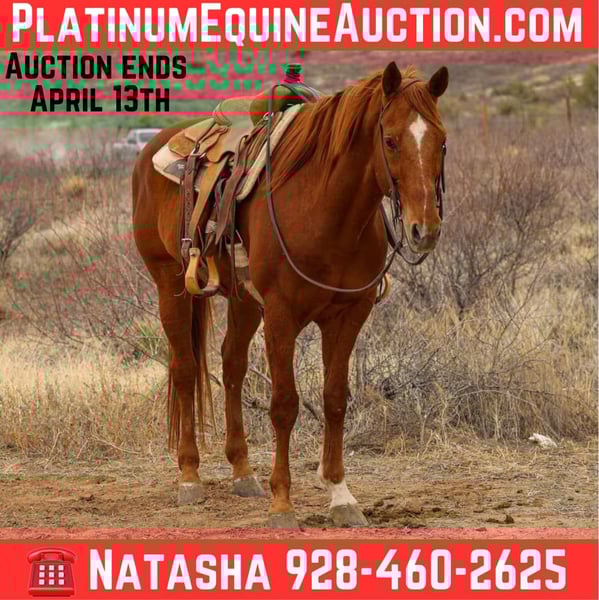 ONLINE AUCTION Place your bids at www.PlatinumEquineAuction.com Starting Bid $3500 Auction ends April 13th, 2025 Need a new saddle? Check out White Rock Saddles on our website or Facebook! Benjamin is a grade 10 year old gelding standing 15.2hh. Don’t let Benjamin’s height scare you off, he is absolutely gentle and will stand like an absolute statue to mount whether you’re using a mounting block, a rock or a fence. This flashy gelding is sure to get you noticed wherever you take him! Whether you’re looking to cruise on down the trail or lope flawless circles in the arena, Benjamin is your man!! Benjamin will walk, trot, and lope both ways slow and steady with ease on a draped rein as well as neck rein. He will even ride bareback, and no need for a bridle! He’ll ride just as good bridless!! This big pretty gelding isn’t just an arena horse, he’ll go absolutely any direction you point him outside!! Flowing waters, thick brush, steep terrain, rough rocky country, you name it and Benjamin will mosey on through it!! Benjamin is very gentle, in your pocket, and broke making him a great fit for any level rider! He is easy to catch and good to groom, saddle, bridle, bathe, shoe, and load! Will come with a clean coggins and health! Transport can easily be arranged anywhere in the US!!! Located in Camp Verde, AZ. Located in Camp Verde, AZ. Contact D/C Equine Services Dallas 804-822-2233 Natasha 928-460-2625 ONLINE AUCTION Place your bids at www.PlatinumEquineAuction.com Starting Bid $3500 Auction ends April 13th, 2025 Need a new saddle? Check out White Rock Saddles on our website or Facebook!