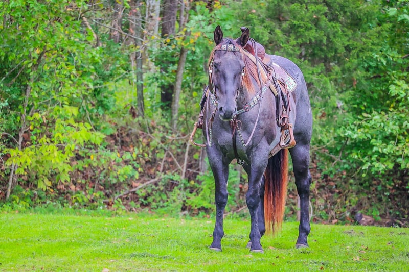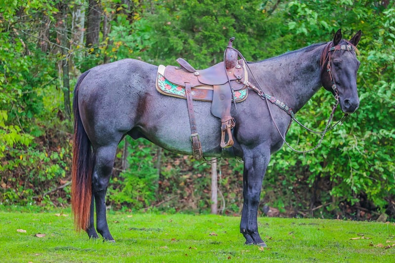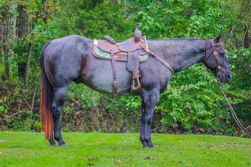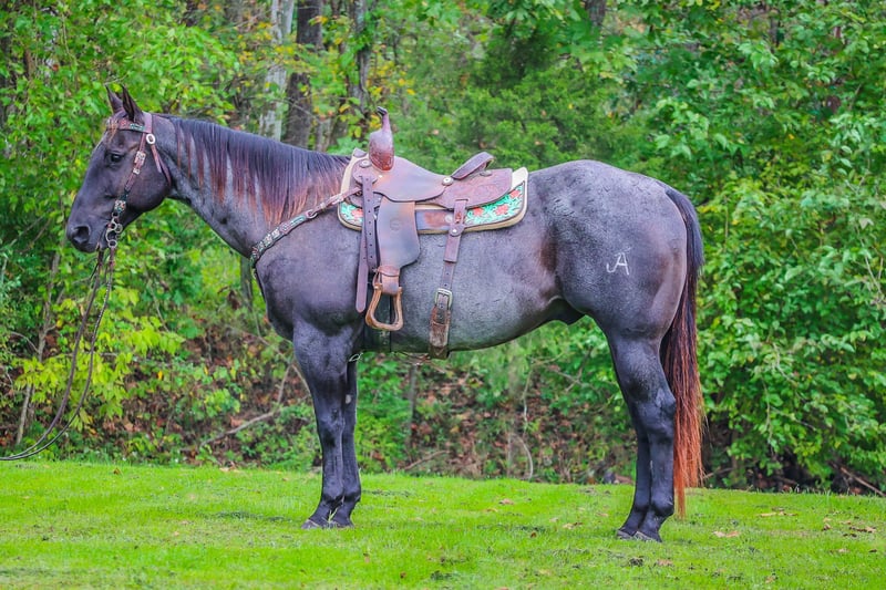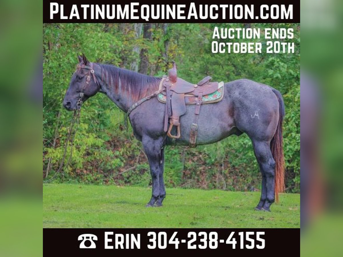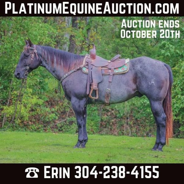 ONLINE AUCTION Place your bids at www.PlatinumEquineAuction.com Starting Bid $3500 Auction ends October 20th, 2024 Need a new saddle? Check out White Rock Saddles on our website or Facebook! This is “BLUE BAMA CANNON”, a registered AQHA TRUE BLUE ROAN GELDING that has done all aspects of ranch work. He has been used in the stockyards and is very cowy, athletic, and fun to ride. He has ponied many other horses. He has been roped off of lots outside in the pasture. He has also been roped off of out of the box. He is also patterned and has been hauled and shown at the junior rodeos. This gelding is a superb trail horse that will go anywhere you want to go. He has a nice turnaround, a solid stop, he will back up, move off of leg cues, and you can open and close gates off of him. He is very personable, friendly, civilized, and gentle. He has no problematic behavior what so ever. He has excellent ground manners, stands tied, loads, bathes, and hauls with no fuss. He is thick made, stands 15.2 hands tall, and is 9 years old. He is a true blue roan with a good foot, solid bone, and a sturdy build. You can take him to get your ranch chores done or enjoy him for leisurely trail rides. He will go anywhere you want to go courageously and bravely. He crosses any depth of water and can handle steep and rocky terrain. He is versatile, well trained, very experienced, and intelligent. He is the package deal with good breeding and an excellent attitude. He lopes nice circles, will one step lope, and he catches his leads. Don’t miss out if you have been wanting a true blue that is a solid and seasoned ranch horse. Call HH Horses Erin 304-238-4155 Located in Flemingsburg, KY. ONLINE AUCTION Place your bids at www.PlatinumEquineAuction.com Starting Bid $3500 Auction ends October 20th, 2024 Need a new saddle? Check out White Rock Saddles on our website or Facebook!