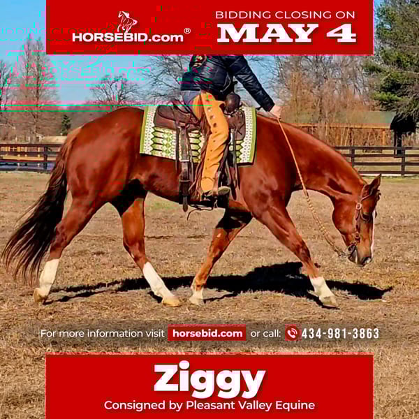 ▪️▫️◾️𝐭𝐡𝐞 𝑴𝒂𝒚 𝐒𝐞𝐥𝐞𝐜𝐭◾️▫️▪️ Happening now thru MONDAY | MAY 4th - Available EXCLUSIVELY on HorseBid's website! For more details and to register visit: www.Horsebid.com CONSIGNOR CONTACT: Pleasant Valley Equine 434-981-3863 LOCATION: Robards, KY BREED: Quarter Horse REGISTERED: Yes REGISTERED NAME: Zip It Up Man COLOR: Sorrel HEIGHT: 15.1 AGE: 11 GENDER: Gelding Ziggy is my personal favorite in the barn, with his puppy dog personality, athletic ability, smooth gates and transition. You couldn't ask for anything better. He loves the trail obstacles and enjoys playing with the tarp, flag, and noodles. He's great with dogs and good with traffic. He's been to hundreds of shows and seen the busy atmosphere. Ziggy also love cattle & been roped on by youth. Ziggy stands 15.1 hands tall & weighs 1200lbs. Ziggy was raised by AQHA elite breeder Tom Moore. He was then started at the University of Findlay & was part of their program for 3 years. He was voted sophomore horse of the year. Then sold to continue his career as an all around horse. The past 4 years Ziggy lived on a cattle ranch in TN as a young youths mount for herd work, doctoring & catching loose cattle. He has literally seen it all & can do it all. Ziggy is sired by the Famous AQHA stud Zippo Can Do, and out of a Dont Skip Charlie mare. If you dream of winning blue ribbons, Ziggy can make those dreams come true. He has extensive training in Western Pleasure, AQHA Trail, Showmanship, and Hunt-seat. He also has all the fancy buttons, but he is honest and simple to ride. He's absolutely the same horse everytime you step on him. Great for any Novice, Amature, or beginner. If your looking to get into the ranch shows, Ziggy can do that too. He has a big beautiful long trot when asked. You can even pull logs and throw a rope off him. If you enjoy ground work Ziggy is a blast to work on the ground from lunging to halter-less showmanship. Ziggy has the best confirmation and will do exceptionally well in Halter classes. Ziggy is easy to clip and stands for the farrier. Loads in and out of any type of trailer. Stands great at the trailer for day shows and stalls well for long weekend shows. Ziggy sells sound with a full UTD on vaccinations, recent radiographic & a letter of soundness from a licensed veterinarian. Buy with confidence. Call today to set up an appointment to meet Ziggy.