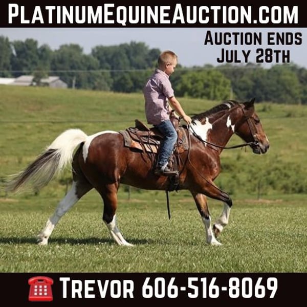 ONLINE AUCTION Place your bids at www.PlatinumEquineAuction.com Starting Bid $3500 Auction ends July 28th, 2024 Need a new saddle? Check out White Rock Saddles on our website or Facebook! Everyone meet JoJo. JoJo is a 10 year old sharp little bay and white tobiano pony gelding standing 12:1 hands tall! JoJo has spent all of his life in the hills of Tennessee being ridden by the children. I purchased JoJo off a really good friend of mine and his children had outgrew him. But don’t let his size fool you, he has a heart the size of Texas! In the mean time JoJo has been my 6 year old nephews main trail mount all summer. We have ridden him all over the big south fork where he has seen steep hills and deep creeks. He watches where he’s going and doesn’t get in a hurry. He crosses creeks, logs and ditches with ease. He has a nice smooth walk, trot, and short lope and rides around like daddies big horse! JoJo is a good step-up horse for the kids that have own-grown their “pedal ponies”. He stands to be tacked up and mounted. He stands like a statue for the farrier. He loads, hauls and bathes like he’s supposed to. If you’re looking for a step up pony for your children, don’t hesitate to give me a call about JoJo! Call Trevor Patrick 606-516-8069 Located in Parkers Lake, KY. ONLINE AUCTION Place your bids at www.PlatinumEquineAuction.com Starting Bid $3500 Auction ends July 28th, 2024 Need a new saddle? Check out White Rock Saddles on our website or Facebook!
