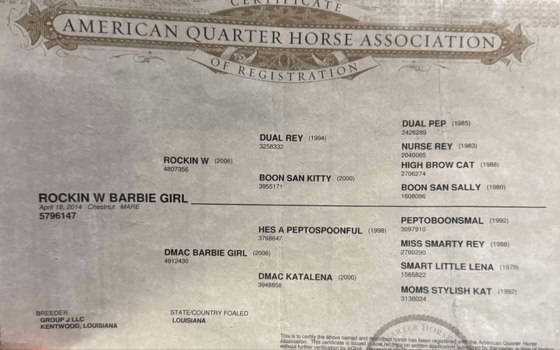 NLINE AUCTION Place your bids at www.PlatinumEquineAuction.com Starting Bid $3500 Auction ends July 13th 2025 Need a new saddle? Check out White Rock Saddles on our website or Facebook How about this gorgeous gal? Rockin W Barbie Girl aka Tina is a great all around fun mare to have in the barn! She is 11 years old and stands 14.2hh tall! Tina is very handy broke, has a nice turn around, big stop and super light in the face! She moves off your legs and lopes around smooth as butter right out of her tracks. Tina is ready to haul on both the heel side and in the breakaway! She is easy as they come and is a point and go mare. She’s been day worked on a bunch and has plenty of run as well. T has been through the barrels, used as a turn back horse and has been to countless sortings. She will carry flags, is good in traffic and on roads/highways. We hauled her to the famous Fort Worth Stockyards to ride her through the busy day downtown there and she didn’t ever have a care in the world, was just happy to be there! IRE: ROCKIN W (2006). $329,722: NCHA Open Futurity Champion; top 10 NCHA Open Derby; 4th NCHA Limited Open Futurity; split 3rd Brazos Bash Open Derby; finalist NCHA Open Classic/Challenge. Full brother to RW ROCKIN ($202,578: Breeders Inv. Open Derby Reserve Champion); half-brother to BOON SAN SPOON ($171,207: NCHA Open Classic/Challenge Champion), THE BOON ($76,156: NCHA Open Classic/Challenge Co-Reserve Champion). Out of BOON SAN KITTY ($565,504: NCHA Horse of the Year [shared], NCHA Hall of Fame). Sire of 68 money-earners, including ROCKIN SALLYCAT ($125,033: split 3rd NCHA Open Futurity), ROCKIN KW ($109,695: Arbuckle Mountain Open Derby Co-Reserve Champion), ROCKIN HISTORY ($100,000: Road to the Horse 3-Year-Old Challenge Champion), ROCKIN A LIL ($52,261: Barrel Racing Daze Futurity 1D Champion), SMART ALICE LOUISE ($47,717: finalist NCHA Open Futurity), ONE GOOD LOOKIN BABE ($47,652: split 6th NCHA Non-Pro Futurity), SHESMISSCONGENIALITY ($44,434: finalist NCHA Non-Pro Futurity), ROCKIN CAT MORIA RG ($36,610: top 10 NCHA Non-Pro Super Stakes), PATTIE ROCKS ($23,299: finalist Breeders Inv. Open Derby), ROCKIN HANGEM HIGH ($16,307: finalist NCHA $100,000 Amateur Futurity), ROCKIN ECLIPSE ($16,258: 3rd Congress Open Derby). DAM: DMAC BARBIE GIRL (2006). A daughter of HES A PEPTOSPOONFUL, $72,851: top 10, NCHA Open Futurity; Suncoast Winter Cutting Non-Pro Derby Champion. A 2017 AQHA Top 10 Sire of Cutting Point-Earners; 2017 AQHA Top 25 Sire of Cowboy Events Point-Earners; A QData Top 25 All-Time Sire of Cutting Money-Earners. Sire of 432 money-earners, $8,017,772, earners of 2,763 AQHA points, including CHERRY CHEX DUALLY ($251,103: Abilene Spectacular Open Derby Champion), SPOONFULLA CAT ($247,426: finalist NCHA Open Futurity; NCHA Silver Award), SPOONFUL OF CHEERIOS ($238,267: 3rd NCHA Open Futurity), THE SILVER SPOON ($238,235: 4th NCHA Open Futurity), LITTLE SILVER BELLES ($201,763: Cotton Stakes Open Derby Champion), A SPOONFUL OF STYLE ($195,270: split 6th NCHA Non-Pro Classic/Challenge; NCHA Bronze Award), BOON SAN SPOON ($171,207: NCHA Open Classic/Challenge Champion), CROSSING RED RIVER ($158,608: NCHA $5,000 Novice Horse Non-Pro World Champion), DMAC SPICY SPOON ($156,149: 5th NCHA Open Super Stakes), HES A HEAPINSPOONFUL ($146,247: split 6th NCHA Super Stakes Non-Pro Classic), PLAYIN WITH A SPOON ($144,698: 6th NCHA Non-Pro Futurity), SPORK ($135,206: NCHA Non-Pro Super Stakes Reserve Champion), SHESA DIRTY MARTINI ($133,111: 3rd NCHA Open Super Stakes), SHES FUL OF DIAMONDS ($122,399: NRCHA Open Futurity Reserve Champion), PRF SPOONFUL OF GOLD ($111,465 and 70 AQHA points: NRCHA Open Derby Reserve Champion), ECHOS FROM THE PAST ($104,678: top 10 NCHA Open Derby), A COPPER SPOONFUL ($104,048: NCHA $50,000 Amateur Co-World Champion; NCHA Bronze Award All an all, you can put absolutely anyone on this mare to do absolutely anything! With her breeding, that speaks volume! Tina is turned out with other mares and geldings, low on the pecking order and gets along with everyone. She also does very good stalled and eats and drinks well on the road. She stands to be saddled, stands good for the farrier and vet, and is easy to catch! She is UTD on everything and just had his teeth done. Tina is a clean slate ready for anyone to use! 11 yrs old 14.2 gentle sound conformationally correct ready to haul both heeling and break away located in Lipan, Texas For more information or any questions contact MaKenna Hartzell call or text 817-659-3778. ONLINE AUCTION Place your bids at www.PlatinumEquineAuction.com Starting Bid $3500 Auction ends July 13th 2025 Need a new saddle? Check out White Rock Saddles on our website or Facebook