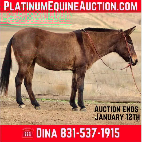ONLINE AUCTION Place your bids at www.PlatinumEquineAuction.com Starting Bid $3500 Auction ends January 12th, 2024 Need a new saddle? Check out White Rock Saddles on our website or Facebook! Meet Apple Your New Favorite Mule! I just have to tell you about this amazing Grulla Molly mule named Apple! If you’re on the hunt for a trailblazing obstacle connoisseur, then look no further. Seriously, this sweet girl is the definition of gentle and has a heart that’ll steal yours in no time. Standing at 14.2 hands and with a solid 10 years of experience, she’s proven herself time and again on the ranch. Whether it’s gathering cattle, branding, or tackling all sorts of tasks, she does it all with such grace! Apple has traveled countless miles with her riders, and let me tell you, her temperament is just outstanding. She breezes through obstacles like tarps and bridges, and she’s even been ridden bareback through Christmas lights! How cool is that? Her calm demeanor shines in every situation, and she adapts effortlessly to side saddle or bareback riding no trail is too steep or windy for this sure-footed companion! She’s incredible her ability to cross water, walk over fallen trees, and forge through thick brush with ease Talk about reliable! In the arena, Apple struts her stuff with an effortless walk, trot, and lope, showing off her cool nature and playful spirit. Plus, she’s got a nice stop that makes riding a total joy! Oh, and did I mention how easy she is to catch, groom, and bathe? She’s good for the farrier too, and she doesn’t even need shoes! Her low-maintenance personality is a huge plus for anyone looking to add her to their family. Loading into trailers? A total breeze! Apple hauls like a champ and rides excellently every time. It’s honestly rare to find a mule as extraordinary as Apple. She’s a one-of-a-kind gem with a unique combo of traits that make her truly special! If you want more info, reach out to Longhorn Ranch in Paicines, CA. You can contact Dina at 831-537-1915. Trust me, you don’t want to miss out on this sweet girl! ONLINE AUCTION Place your bids at www.PlatinumEquineAuction.com Starting Bid $3500 Auction ends January 12th, 2024 Need a new saddle? Check out White Rock Saddles on our website or Facebook!