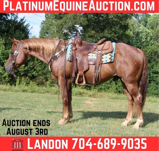 ONLINE AUCTION Place your bids at www.PlatinumEquineAuction.com Starting Bid $3500 Auction ends August 3rd, 2025 Need a new saddle? Check out White Rock Saddles on our website or Facebook Charlie Sheen is an 11 year old stocky built red roan gelding! He stands at 14.3 hands with a strong foot and sturdy build. He’s easy on the eyes and has a great head on his shoulders with a temperament anyone will fall in love with. He rides with a one hand neck rein and a willingness to please. Charlie will walk, trot, lope with ease and elegance. You can see how unbothered he is by anything you throw his way. He is gentle every day and suits anyone. Laid back enough for the trail rider to enjoy. We have had him on several camping trips and took everything well! He is awesome on the trails and crosses every obstacle with no hesitation. Don’t miss out on this handsome gelding! Located In Cherryville NC and we can ship anywhere. For more info, to schedule a time to come see him or to make a Buy It Now Offer Call Landon with Maxwell Family Trail Horses 704-689-9035 for more info. ONLINE AUCTION Place your bids at www.PlatinumEquineAuction.com Starting Bid $3500 Auction ends August 3rd, 2025 Need a new saddle? Check out White Rock Saddles on our website or Facebook