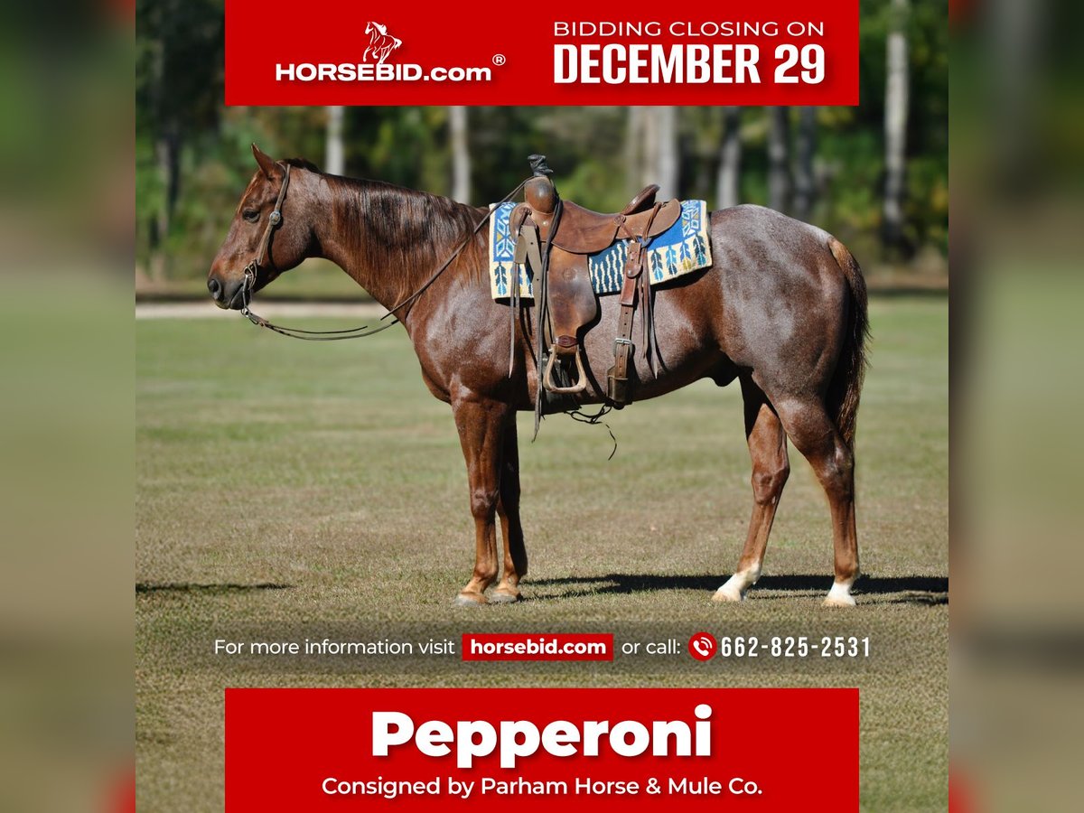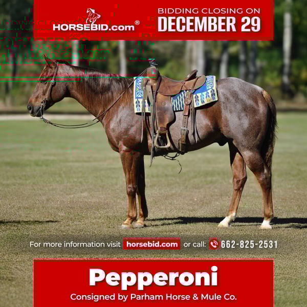 ⚜️𝐓𝐇𝐄 𝓗𝓮𝓻𝓲𝓽𝓪𝓰𝓮 𝐖𝐢𝐧𝐭𝐞𝐫 𝓒𝓵𝓪𝓼𝓼𝓲𝓬⚜️ Happening now thru MONDAY | DECEMBER 29th - Available EXCLUSIVELY on HorseBid's website! For more details and to register visit: www.Horsebid.com CONSIGNOR CONTACT: Parham Horse & Mule Co. 662-825-2531 LOCATION: Amory, MS BREED: AQHA REGISTERED: Yes REGISTERED NAME: JV PEP UP SMUCKER COLOR: Red roan HEIGHT: 15 AGE: 11 GENDER: Gelding Pepperoni is an 11-year-old AQHA gelding standing a solid 15 hands tall, and he is the kind of horse that quietly earns your trust every time you swing a leg over him. He is the same dependable partner whether you ride him once a week or every day, and that consistency is what truly sets him apart. This gelding is genuinely in your pocket and thrives on human interaction. He enjoys attention, seeks out his people, and has a calm, kind demeanor that makes him a pleasure to be around both on the ground and under saddle. Pepperoni is not reactive or nervous by nature — he approaches new situations with a level head and a willingness to try. Pepperoni has been extensively trail ridden in all types of terrain, confidently handling hills, uneven footing, and changing environments with ease. He has also been ridden in city parades, exposed to crowds, traffic, noise, and commotion, and has proven himself reliable and unfazed in those settings. He is comfortable riding alone or with others and will confidently ride in any position within a group — front, middle, or back — without issue. Under saddle, Pepperoni walks, trots, and canters willingly and smoothly, picking up both leads as asked. He is responsive without being pushy and has the kind of patience that is increasingly hard to find. He neck reins, side passes, and stands perfectly still for mounting, making him suitable for riders of varying experience levels. He has been ridden both western and English, showing versatility and adaptability in different disciplines and tack. What truly makes Pepperoni special is his temperament. He is family safe, kind, forgiving, and unbothered by mistakes. He does not rush, anticipate, or become frustrated, and he takes care of his rider. Whether you’re looking for a dependable trail partner, a family horse, or a well-rounded gelding to enjoy in a variety of settings, Pepperoni offers the kind of steady, honest disposition that builds confidence rather than tests it. Pepperoni is a horse you can trust — not because he’s flashy, but because he is proven, patient, and genuinely enjoyable to ride and be around. Horses like this don’t need exaggeration; they speak for themselves once you get to know them. Contact Dustin Parham at 6628252531 to schedule a visit with Pepperoni