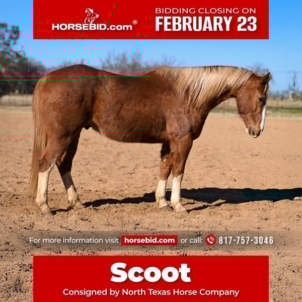 💎 𝐓𝐇𝐄 𝓓𝓲𝓪𝓶𝓸𝓷𝓭 𝐒𝐇𝐎𝐖𝐂𝐀𝐒𝐄 💎 Happening now thru MONDAY | FEBRUARY 23rd - Available EXCLUSIVELY on HorseBid's website! For more details and to register visit: www.Horsebid.com CONSIGNOR CONTACT: North Texas Horse Company 817-757-3046 LOCATION: Weatherford, TX BREED: QH REGISTERED: Yes REGISTERED NAME: Irish Scoot COLOR: Sorrel HEIGHT: 15.1 AGE: 12 GENDER: Gelding Irish Scoot aka “Scoot” is a 12 yr old, 15.1H sorrel gelding with gorgeous roan flakes and flaxen mane that give him the true ranch horse look everyone loves. He’s been a true ranch horse is whole life and has been used all across the country from California to Kentucky. He’s absolutely broke like a good ranch horse should be and is easy to operate. Scoot neck reins with ease, stops right when you ask him to and won’t switch gaits until you tell him to! He’s been roped off extensively and is even patient enough for the novice roper but handy enough to get the job done for a seasoned cowboy. The girl roping in his video has hardly any experience swinging a rope and he was an absolute SAINT for her to play on. Scoot goes over obstacles and anything the trail might throw at you. He’d be a great trail horse for someone wanting a handy broke ranch type with a lot of feel, or take him straight to work on a ranch! He would also be a great team roping prospect on either end! Scoot is absolutely sure to get any job done WELL! He is UTD on teeth, feet and coggins. More pics and videos on his website page at northtexashorsecompany.com/scoot. Please call Blair with North Texas Horse Company for more info at 817-757-3046. We are located in Weatherford, TX and can help arrange affordable shipping to anyone!