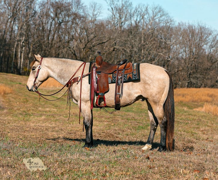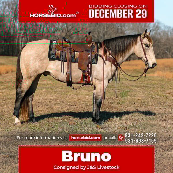 ⚜️ 𝓗𝓮𝓻𝓲𝓽𝓪𝓰𝓮 𝐖𝐢𝐧𝐭𝐞𝐫 𝓒𝓵𝓪𝓼𝓼𝓲𝓬⚜️ Happening now thru MONDAY | DECEMBER 29th - Available EXCLUSIVELY on HorseBid's website! For more details and to register visit: www.Horsebid.com CONSIGNOR CONTACT: J&S Livestock 931-242-7226 or 931-698-7159 LOCATION: Santa Fe, TN BREED: Quarter Horse REGISTERED: No REGISTERED NAME: Bruno COLOR: Buckskin HEIGHT: 15.1 AGE: 11 GENDER: Gelding Meet Bruno an absolutely gorgeous, gentle 11 yr old buckskin gelding standing 15.1hh, and the true definition of steady and kind. Bruno is very well mannered and it shows. He has an excellent temperament, plenty of training, ranch work experience, and the type of kind and gentle nature that’s truly hard to find! He is built correctly- big boned and built to last. He genuinely loves being around people and soaking up all the attention you could possibly give him. Bruno is a very confident ride. Whether you’re out on the trails, riding next to roaring farm machinery, working cattle, or riding through the busy downtown city traffic, he’ll always take care of you. He is use to ranch work, pushing cattle, pasture roping, checking fences, etc. As for the trails, if asked he will safely take you up or down some sketchy terrain with nothing but patience. He isn’t going to spook at wildlife, dogs, or even angry bulls out in the pasture. He handles it all calmly and sophisticatedly. Bruno is so honest and full of try. He will be just as confident solo as he is in a group, which makes for such a worry-free ride! Smooth, safe, comfortable, and responsive are a couple of the things that best describe Bruno’s qualities. He has a nice stop, comfortable steady trot, and smooth lope. On the ground Bruno is super easy to catch, hauls and loads like a pro, stands patiently to be groomed or bathed, and is also great for the farrier. He always has the best attitude- quiet, yet athletic and is always up for a challenge. If you are looking for the most kind-hearted gelding with actual real-life experience, then look no further than Bruno! Bruno is 100% sound and recently passed his PPE which is pictured above. For any further info please feel free to reach out at anytime- Bailey 931-242-7226 or JT 931-698-7159