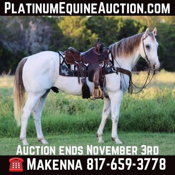 NLINE AUCTION Place your bids at www.PlatinumEquineAuction.com Starting Bid $3500 Auction ends November 3rd, 2024 Need a new saddle? Check out White Rock Saddles on our website or Facebook! You guys are not going to want to miss this! If you’re looking for the ultimate all around family horse for absolutely everybody…Just stop scrolling because you’ve just found the one! Our guy Lloyd is once in a life time gelding. ◻️An absolutely Bombproof, gentle kind soul for any age from 9-99? A horse that is handy enough but calm enough to do any job or anything you ask of him? The ultimate kids horse that they can have hours of fun with? ◻️A flag horse? Parade horse? The perfect gelding to ride down the trails all day long without any trouble whatsoever? A great lesson horse? Or Drill team? Maybe a sorter? To go ranch on? ◻️A playday horse? How about this guy! We just took him the the chuck wagon races all weekend and he handled it like a pro, check out his video! There was loud noises, fireworks, screaming people, and just a whole lot of craziness! We cannot say one bad thing about this guy! Lloyd is an old soul and deserves the absolute best home and we will make sure of it! He is 15.1hh tall and just 10 years old! He’s kind, patient and always willing to work! He saddles very quiet and always rides off the same everytime. Lloyd has been used to work cattle, Give riding lessons, and trail rode extensively! He is the smoothest thing you can sit on, with a rocking chair lope and a floating smooth trot! Lloyd would be perfect for a grand entry horse or even a rodeo announcers horse. He has been rode by all ages! I would trust him with anyone that can hold a pair of reins and sit in the saddle! He hauls great loads and backs off the trailer. He can be turned out with others or by him self. He will ride out alone or ride nose to tail. He will stand tied all day long as well. Lloyd is very patient with beginners and puts up with a lot! Absolutely no buck, rear, kick, runoff, silliness whatsoever. He has a beautiful floating trot, lopes off great both directions and never misses a beat! There aren’t many horses out there like him, you truly won’t be disappointed! Be sure to check out his video below, worth the watch! Located in Stephenville, TX. We can help arrange hauling anywhere in the US, Hawaii or Canada! We have an amazing 5 star hauler that goes anywhere in the country! Please call or text Makenna Hartzel 817-659-3778 for more information. ONLINE AUCTION Place your bids at www.PlatinumEquineAuction.com Starting Bid $3500 Auction ends November 3rd, 2024 Need a new saddle? Check out White Rock Saddles on our website or Facebook!
