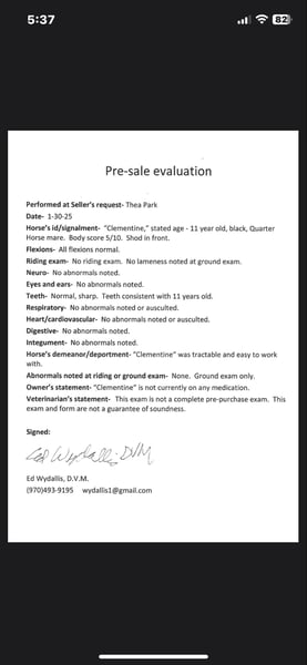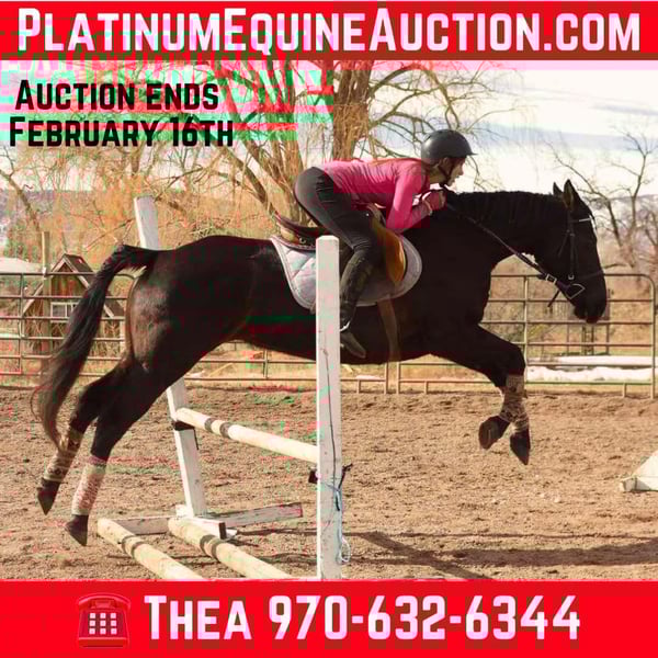 ONLINE AUCTION Place your bids at www.PlatinumEquineAuction.com Starting Bid $3500 Auction ends February 16th, 2025 Need a new saddle? Check out White Rock Saddles on our website or Facebook! “CC CLEMENTINE” is an 11 year old registered 2013 Quarter Horse (Appendix) mare! Standing 15.2 hands and built extremely well this mare is ready for anything you want to throw at her! Clementine is very versatile and can go English/western or bareback- she’s as simple as they come to ride and is safe for the smallest kiddos (or grandpa and grandma) to have fun on! We have carried tarps and flags with her, dragged logs, pushed cows around and she has 30 days western pleasure training and 30 days of English/jumping work! Clementine has a beautiful walk/jog and lope, an easy simple lead change and knows voice commands! She will cruise through a course without refusing or knocking a jump and has a lot of scope, tuck and athleticism! Clementine will pick you up at the block and knows how to side pass up to anything you ask of her. On top of her English and western training Clementine is fun to just hop and go, a couple of the lesson kiddos have taken her out on the trail bareback with just a halter on! She has seen all of the chaos out on the trail and is not bothered by heavy traffic or bicycles and crowds (check out her video!) Clementine is easy to ride and just all around fun to be around! She gets along with other horses well, is easy for the vet and farrier and does well working frequently or with time off. Come meet this gorgeous gal and see how personality truly shines through everything she does. Located in Fort Collins, CO. Contact Dynamite Horses Thea 970-632-6344 with any questions. ONLINE AUCTION Place your bids at www.PlatinumEquineAuction.com Starting Bid $3500 Auction ends February 16th, 2025 Need a new saddle? Check out White Rock Saddles on our website or Facebook!