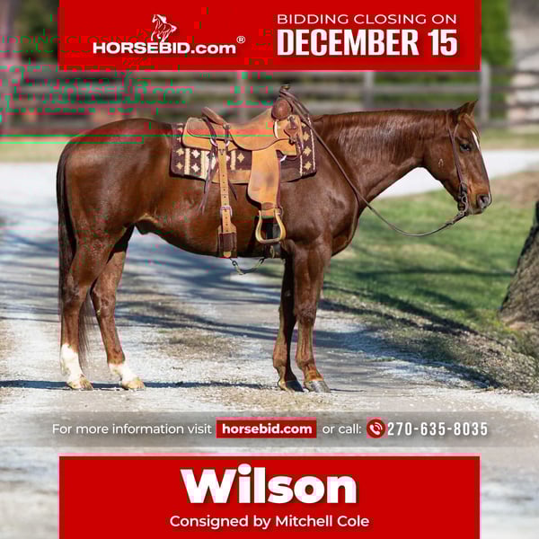 🎄𝐓𝐇𝐄 𝑯𝒐𝒍𝒊𝒅𝒂𝒚 𝐂𝐋𝐀𝐒𝐒𝐈𝐂🎄 Happening now thru MONDAY | DECEMBER 15th - Available EXCLUSIVELY on HorseBid's website! For more details and to register visit: www.Horsebid.com CONSIGNOR CONTACT: Mitchell Cole 270-635-8035 LOCATION: Madisonville, KY BREED: AQHA REGISTERED: Yes REGISTERED NAME: Bo Camero Dynamite COLOR: Sorrel HEIGHT: 15.3 AGE: 11 GENDER: Gelding Meet Wilson. Wilson is an 11 year, AQHA gelding standing 15.3, and is by far the nicest gelding that I have ever offered for sale. Combining his temperament, ability, willingness, athleticism, and disposition makes it nearly impossible to find another. Wilson has been owned by some of the best hands in the business in the past, and it shows everyday. He stands for the farrier, stands tied, loads and unloads with ease, and is just a true gentleman to be around! He has been used outside extensively in West Texas, Minnesota, Kansas, and western Kentucky. There isn’t much that Wilson hasn’t seen or done. He is a true ranch horse! Not only is Wilson a true ranch horse, but a very experienced trail horse as well spending miles in the woods! He has been ridden across the plains, as well as in the mountains. Nothing stops this guy. Just point, and he will go with zero hesitation! In the arena he is an absolute dream to ride! He catches both leads with ease, is a true one handed gelding, and can go all day! The best part about Wilson in my opinion? He is a finished head horse for nearly any level of roper! With the team roping payouts growing larger every day, he would make a great investment! In conclusion, Wilson checks all the boxes! Geldings like him do exist, but they are rarely offered for sale. Offering Wilson for sale was a tough, long thought out decision. We have owned very few like him, and he deserves nothing but the best home. He is gentle for nearly any level rider. Wilson sells 100% sound with no vices. He is UTD on his vacations. Pre Purchase exams are always welcome at the buyers expense. Shipping can be easily arranged! If you wish to come and try Wilson, please don’t hesitate to reach out to me at (270) 635-8035!