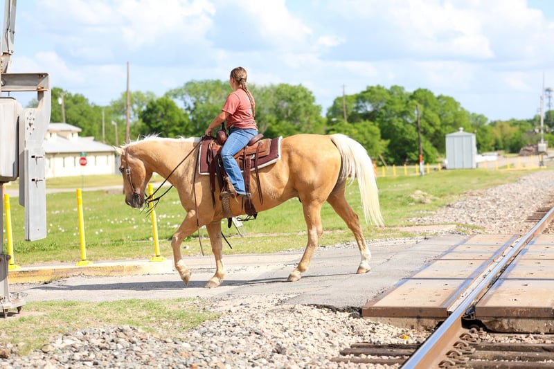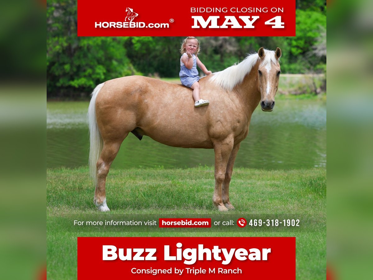 ▪️▫️◾️𝐭𝐡𝐞 𝑴𝒂𝒚 𝐒𝐞𝐥𝐞𝐜𝐭◾️▫️▪️ Happening now thru MONDAY | MAY 4th - Available EXCLUSIVELY on HorseBid's website! For more details and to register visit: www.Horsebid.com CONSIGNOR CONTACT: Triple M Ranch 469-318-1902 LOCATION: Forney, TX BREED: Quarter Horse REGISTERED: No REGISTERED NAME: Buzz Lightyear COLOR: Palomino HEIGHT: 14 AGE: 13 GENDER: Gelding Let me introduce you to Buzz Lightyear. A super cute old fashioned made golden palomino gelding. He is one of those BOMBPROOF UNICORN type gelding! Buzz is the perfect little fun size horse standing 14 hands tall. He has been part of our family for along time now and has taught so many kids how to ride. Buzz is just 13 years (vet confirmed the age) so still has a lifetime to be rode and enjoyed. He has manners and rides around like a solid ranch horse should, he's as broke as broke gets and I would trust him with any kid, small adult, grandma or grandpa, any age, beginner, timid rider, etc.. Doesn't matter. You can ride him and he will take care of you. I trust anyone can ride him anywhere. Absolutely NO kick or buck in him! Absolutely no bad habits! Absolutely no maintenance. He is simple, easy, and fun to ride. He has been more miles and seen more country than most people! When I say he's been there and done that I mean it, he knows what a hard days work is outside in the country and will last all day. He is one handed broke, neck reins, and has a good stop! He has always been willing to go or do anything they have asked. He will ease thru the creeks/ponds, thickets, traffic safe, train safe, machinery safe, loud noises don't bother him. He's been to ropings, barrel races, rodeos, spent many long days working cows, dragging calves, hog hunting, swimming ponds, tied out camping, and been thru every aspect of the woods from thickets to boggy creeks, and trail riding down the roads. Trains honking and going by don't bother him, he will ride right next to it. We carry multiple buckets of feed strapped over his back to help carry to feed. Buzz Lightyear has also been used to carry the American flag for the National Anthem at rodeos. He is BOMBPROOF, absolutely no spook at all and will go anywhere he is pointed, he never refuses or says no. He is a once in a lifetime time little horse. He is one of those that is as honest as the day is long. He's easy to catch, bathe, and hauls like a champ. He has the biggest heart. I trust this little horse enough for little kids to run up to him from the front or back and he will stand like a rock. You can go rope on him, pop bull whips, run barrels, run poles, goats tie, TRICK RIDE, breakaway, and trail ride! Buzz will walk, trot, lope, or go as fast as you want. He is the coolest horse around. He leads, loads, ties, bathes, clips, and stands for the farrier. Very easy keeper. Requires nothing special. We keep him barefoot but you can shoe him if you want. Please don't hesitate to call us about, we love to talk to you about him. He is 100% safe and sound in every way. We had our vet do a pre evaluation on him included in the pics. We can help with making shipping arrangements to anywhere needed. Buzz is ready for his new home.
