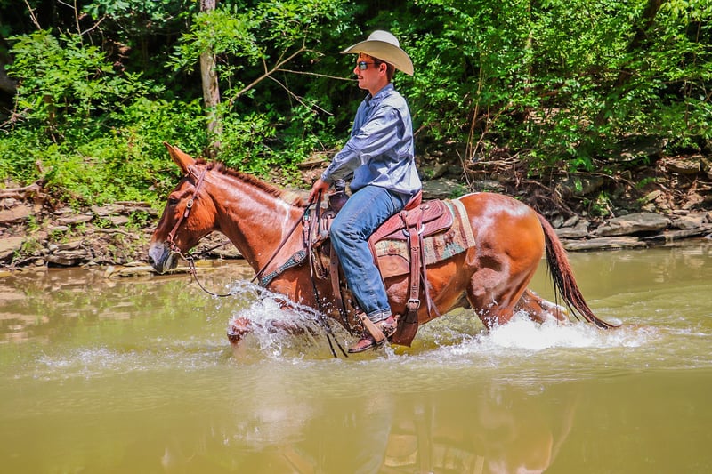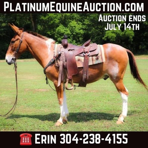 ONLINE AUCTION Place your bids at www.PlatinumEquineAuction.com Starting Bid $3500 Auction ends July 14th, 2024 Need a new saddle? Check out White Rock Saddles on our website or Facebook! This is “Daniel”, a true one of a kind RED DUN & WHITE JOHN MULE that is well trained, gentle, and civilized. This mule is 11 years old and stands 14.2 hands tall. He has a very large resume and has been there and done that. He has been ridden English and Western. He has been to the open shows and shown by a novice rider. He will collect up nicely and slow jog or he will move out into an extended trot. He is soft in the bridle and will break at the poll. He has been used for ranch work in the pasture sorting and pushing cattle by an older gentleman. He has been on the moonlit rides and is sure footed in rough country. He has been shot off of and used for hunting in the mountains. He has also been used to lead a pack string. He has an extremely comfy and easy to sit canter. He catches his leads, lopes circles, and stops nicely. He will back up, move off of leg cues, and he has a true one hand neck rein. He stands to mount, tack, and groom. He picks up all four feet and handles his ears with no issues. He takes his time in unsure footing, unloads in new territory and rides off quiet, and has no buck and no hump. This mule loads, bathes, hauls, and has the best ground manners. He rides out alone with confidence and will bring up the rear or lead the pack. He is traffic safe, good with dogs, and will go anywhere you point him without hesitation. He will ride bareback, double, and in just a halter and leadrope. Don’t miss out if you want a mule that will make you look like a mule skinner even if you aren’t. He’s obedient, kind, personable, and loves to trail ride. Contact HR Horses Erin 304-238-4155 with any questions or to set up a time to come see him in Flemingsburg, KY. BIN offers are considered. Thanks! ONLINE AUCTION Place your bids at www.PlatinumEquineAuction.com Starting Bid $3500 Auction ends July 14th, 2024 Need a new saddle? Check out White Rock Saddles on our website or Facebook!