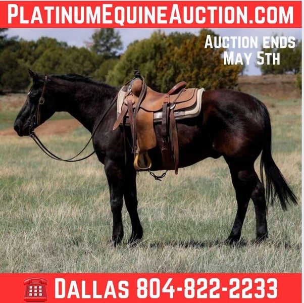 ONLINE AUCTION Place your bids at www.PlatinumEquineAuction.com Starting Bid $3500 Auction ends May 4th, 2025 Need a new saddle? Check out White Rock Saddles on our website or Facebook! Champ is a grade 12 year old gelding standing 14.2hh. This gorgeous and absolutely gentle gelding has been a trail horse his whole life, taking many different ages and levels of riders on countless adventures! No matter what kind of country you’re in, or obstacles you may come across, Champ will confidently mosey on by surefooted as can be without batting an eye. Steep slippery slopes, flowing water, pokey brush, fallen logs, rocky riverbeds, deep sandy washes, or the busy streets of town. You name it and Champ will cruise right along taking great care of you every single step of the way. Champ is in your pocket, safe, reliable, and absolutely gentle! If you’re looking for your next adventure buddy then look no further, Champ is your guy!!! Champ will meet you at the gate to be caught, and is good to groom, saddle, bridle, bathe, trim and load! Will come with a clean coggins and health!! Transport can easily be arranged anywhere in the US!! Located in Camp Verde, AZ. Contact D/C Equine Services 804-822-2233 with any questions. ONLINE AUCTION Place your bids at www.PlatinumEquineAuction.com Starting Bid $3500 Auction ends May 4th, 2025 Need a new saddle? Check out White Rock Saddles on our website or Facebook!