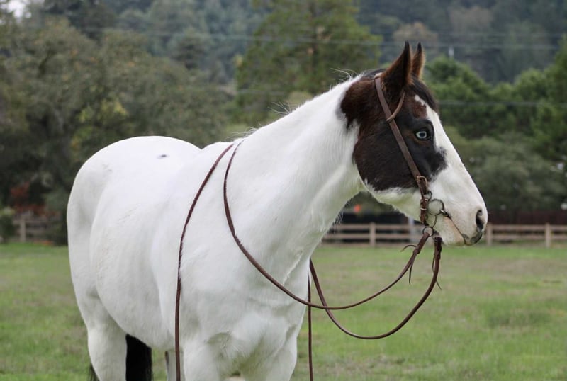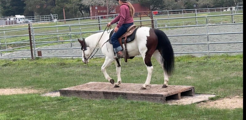 ONLINE AUCTION Place your bids at www.PlatinumEquineAuction.com Starting Bid $3500 Auction ends November 30th, 2025 Need a new saddle? Check out White Rock Saddles on our website or Facebook Blueboy is a handsome 12-year-old, 14.2hh paint gelding with two striking blue eyes and an easygoing, willing personality. He is a joy to be around and very simple to handle, making him a pleasant and reliable partner for a variety of riders. Blueboy has extensive experience on trails, roads, and in the arena. He excels on the trail and genuinely enjoys going on adventures. He travels confidently through steep, narrow terrain and moves with surefooted ease. He will lead the group without hesitation, ride calmly and consistently in the back, or go out alone with no issues. He is not buddy or barn sour and remains steady regardless of the situation. He also loves the water and will cross anything placed in front of him. Under saddle, Blueboy has a natural low headset and is very easy to direct. He neck reins, responds well to leg cues, has a dependable stop, and catches both leads easily in the arena. He is soft, responsive, and comfortable to ride. Blueboy is also good with time off and does not get fresh when brought back into work. He loads and hauls well and gets along nicely with other horses. With his temperament, trail experience, and solid training, Blueboy would make an excellent horse for trail competitions or for anyone looking for a trustworthy, enjoyable partner both in and out of the arena. He is located in Bitterwater, CA. for more info contact Cheyenne at 831-537-8746. ONLINE AUCTION Place your bids at www.PlatinumEquineAuction.com Starting Bid $3500 Auction ends November 30th, 2025 Need a new saddle? Check out White Rock Saddles on our website or Facebook