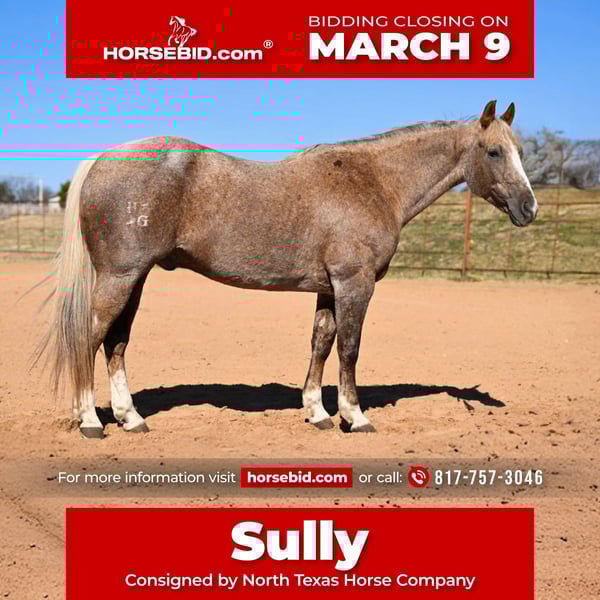 ℳ𝒶𝓇𝒸𝒽 ♦️𝐑𝐈𝐃𝐄𝐑'𝐒 𝐂𝐇𝐎𝐈𝐂𝐄♦️ Happening now thru MONDAY | MARCH 9th - Available EXCLUSIVELY on HorseBid's website! For more details and to register visit: www.Horsebid.com CONSIGNOR CONTACT: North Texas Horse Company 817-757-3046 LOCATION: Weatherford, TX BREED: AQHA REGISTERED: Yes REGISTERED NAME: Cat Dots COLOR: Palomino Roan HEIGHT: 14.3 AGE: 13 GENDER: Gelding Some horses are nice, some are talented, and then there are the ones you spend a lifetime hoping to find. Cat Dots “Sully” is that horse. This 2013 own son of the legendary Metallic Cat is truly one of the most special horses we have ever had the privilege to offer. Standing 14.3H, this palomino roan shines like a bar of gold with a color, presence, and eye appeal we have never seen another like, making him a guaranteed showstopper wherever he goes. But Sully is far more than just a pretty horse. He is exceptionally broke, soft, responsive, and loaded with every button you could ask for. He rides with the feel and power of a high end performance horse when you want to go, yet stays gentle, honest, and forgiving enough for the entire family to enjoy. Sully was started in the reined cowhorse, has been roped off of, sorted and penned, and is also a finished 1D/2D barrel horse. True to his pedigree, his favorite job is anything involving a cow, where his natural ability and confidence truly shine. He is not spooky and has the kind, willing mind everyone searches for, making him an easy ride for anyone who can hold the reins. His personality is just as special as his talent. He is incredibly sweet, loves attention, and is the true in your pocket, aims to please type that wants nothing more than to be someone’s number one partner. From the arena to the ranch to the trails, Sully fits any direction and excels in every job he is given. He is one of our personal horses and was never meant to be offered for sale, but other opportunities have left him sitting on the back burner, and that simply is not fair to a horse like him. Horses with this pedigree, mind, talent, versatility, color, and heart do not come along often. Kids can rope on him, you can go show and win on him, the whole family can enjoy him from cows to barrels, and grandma can safely take him down the trail. Sully does not just check the boxes, he is the ENTIRE package. Make this once in a lifetime horse yours while you can, this opportunity won’t last long. We could talk about this horse for hours, so please give us a call if you have any questions. He is UTD on teeth, feet and coggins! More pics and videos on his website page at northtexashorsecompany.com/catdots. Please call Blair with North Texas Horse Company for more info at 817-757-3046. We are located in Weatherford, TX and can help arrange affordable shipping to anyone!