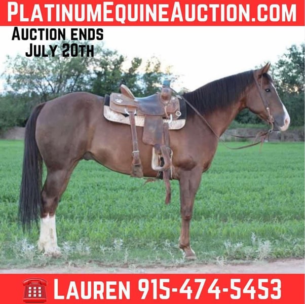 ONLINE AUCTION Place your bids at www.PlatinumEquineAuction.com Starting Bid $3500 Auction ends July 20th 2025 Need a new saddle? Check out White Rock Saddles on our website or Facebook 33 is the absolute all around horse! He’s a true gentleman, a reliable and safe family horse. 33 is a smoooooth traveler! He’s been trail road and ranched on in west Texas. He’s as solid as they come. He’s a very reliable using horse that will get a cowboys job done or be a family horse and cruise down the road for an evening trail ride. 33 is 15h tall, he is 12 years old, he’s got the coolest dark chocolate color. He’s an absolute saint ! He has the personality that will fit any level ride you can walk slow or walk fast, lope slow or lope fast he has any speed you desire to go and will take care of his rider. He is the horse we bring out for the kids or when our city slicker friends come over to ride, he wants to be your friend . We’ve used him in extensively on the ranch from rounding cows up and driving them from pasture to pasture or checking fences. He’s also a solid head horse he’s rope a lot of cattle in and out of the arena. he’s good in the box and will really watch a cow, he’ll be strong to the horn and will get the job done. He knows his leads, he will lope big pretty circles. He’s been around the barrels, flags, tarps, traffic, he’s absolutely safe for any level rider will be safe everyday of the week and 100% reliable. He is easy to shoe, saddle , bathe , load and haul with no issues. He will be straight legged no bumps or blemishes. If you are looking for your next family/kid horse 33 is your guy don’t miss this gem of a horse. Located in El Paso, TX. Contact Lauren Lara 915-474-5453 with any questions. ONLINE AUCTION Place your bids at www.PlatinumEquineAuction.com Starting Bid $3500 Auction ends July 20th 2025 Need a new saddle? Check out White Rock Saddles on our website or Facebook