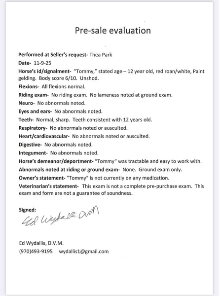 "AVAILABLE ON ONLINE HORSE AUCTION AT www DOT MagicHorseAuction DOT com BIDDING OPEN NOW thru TUESDAY | December 9TH! - BUY IT NOW AVAILABLE! *Final price will be determined on auction site* CONSIGNOR CONTACT INFO: Thea Park 970-632-3644 LOCATION: Fort Collins, CO "★★ TOMMY ★★ Grade Gelding | Finished • Friendly • All-Around Trail & Ranch Partner Tommy is the total package — a thick, gorgeous gelding with a huge heart, sweet disposition, and experience in all the right places. From working cattle to quiet trail rides, he’s the kind of partner who shows up every time with a great attitude and a steady mind. This gelding was previously used in roping and team penning, and lately he’s been excelling in western pleasure, drill team, and trail riding. He’s been a no-nonsense, no-quirks kind of horse — no buck, bolt, or rear. Whether he’s had time off or is ridden regularly, Tommy always comes out safe, sane, and consistent. In the arena, Tommy has a solid walk, jog, and lope, stops just off your voice, and has a finished neck rein. He sidepasses to gates, moves easily off leg pressure, and has collection when asked. He’s been ridden solo and in groups, on the ranch and out on the trail, and always stays level-headed and willing. Out on the trail, Tommy shines. He’s been downtown, through drive-thrus, across rivers, over bridges, and on tough mountain terrain. He’s surefooted, brave, and absolutely unphased by traffic, strollers, bikes, trains, or dogs. He’s reliable in all environments and enjoys getting out for a job or a relaxing ride. Tommy is personable, people-oriented, and absolutely loves his humans. He greets you at the gate every time, gets along with all the horses in the pasture, and stands great for the vet and farrier. He’s forward, responsive, and still gentle enough for a beginner to feel confident and safe. This gelding is built right, trained right, and has the kind of experience that makes him an excellent addition to any program. Watch his video and come meet him — Tommy could be your next dependable go-to partner.