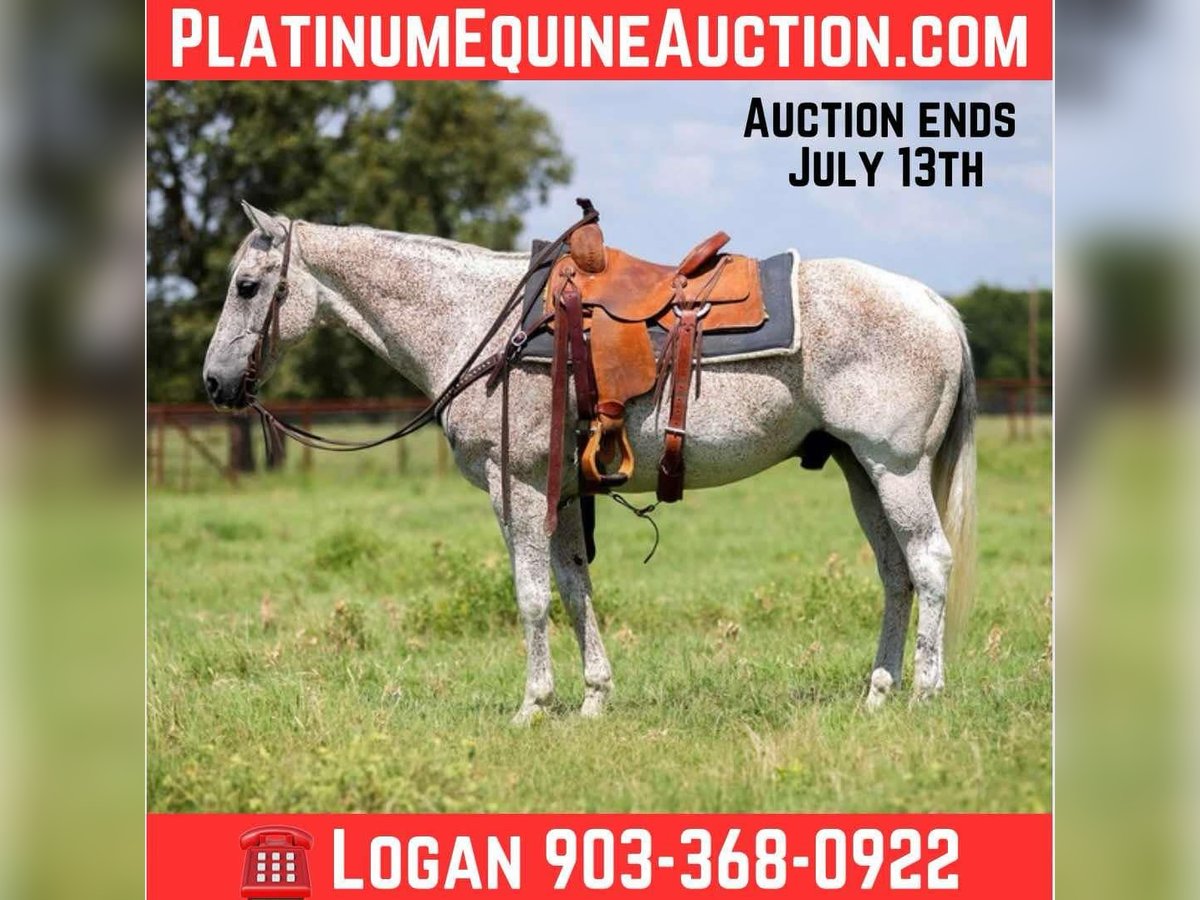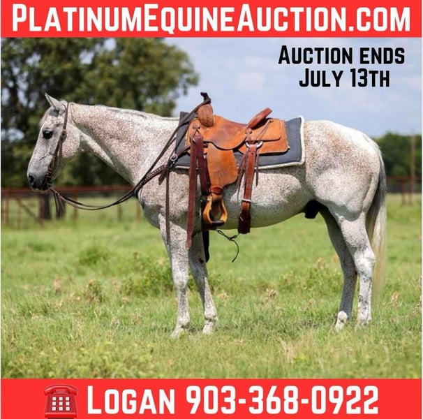 ONLINE AUCTION Place your bids at www.PlatinumEquineAuction.com Starting Bid $3500 Auction ends July 13th 2025 Need a new saddle? Check out White Rock Saddles on our website or Facebook! Snowman is a 15.1 hand grey gelding that checks all the boxes! Snowman is as gentle as they come he is one hand broke rides low headed and with ease and doesn’t spook at anything. If your looking for a gelding that is family safe but also broke enough to go do a job if needed then don’t miss out on this guy here. This gelding has been ridden in all types of country and used to work and doctor cattle as well as flag horse in the parades and grand entry, Snowman is completely sound and safe and ready to join your family! Contact Logan with X5 Ranch 903-368-0922 with any questions. Located in Canton, TX. ONLINE AUCTION Place your bids at www.PlatinumEquineAuction.com Starting Bid $3500 Auction ends July 13th 2025 Need a new saddle? Check out White Rock Saddles on our website or Facebook!