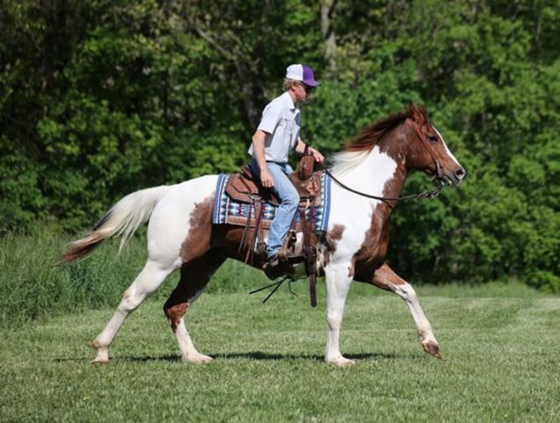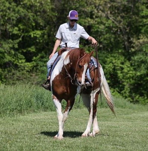 ONLINE AUCTION Place your bids at www.PlatinumEquineAuction.com Starting Bid $3500 Auction ends October 27th, 2024 Need a new saddle? Check out White Rock Saddles on our website or Facebook! Benny is a stout built 15.1H, 11 year old, Sorrel Tobiano Paint Quarter Horse Gelding. Benny is a well traveled horse that has been ridden in several states and has been used as a ranch horse in every aspect of ranch life. He has been grandma’s trail horse and plodded along down the trails. He has herded sorted, pasture roped and doctored, Benny has done it all! He has been trail ridden in several states and used at the stockyards to pen cattle on a few occassions. He will cross creeks, ditches, logs and navigate rough rocky areas. Benny is safe riding in traffic. He has a smooth jog and a good lope! Benny has been exposed to all kinds of wildlife such as deer or turkey or other animals like cows or dogs and will go anywhere that he is asked too. He has been rode many miles in the mountains of Eastern Kentucky and encountered every obstacle possible on the trail. He will go up or down even the steepest slopes, across deep creeks, over downed trees, and over all types of rough terrain while still being sure footed. If you want to feel and look like a real deal cowboy/cowgirl just climb on Benny and he will make you look like one! If you have any questions call Moore Trained Horses Logan 765-265-0033. Located in Level Green, KY. ONLINE AUCTION Place your bids at www.PlatinumEquineAuction.com Starting Bid $3500 Auction ends October 27th, 2024 Need a new saddle? Check out White Rock Saddles on our website or Facebook!