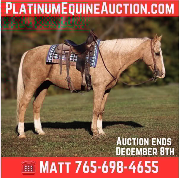 ONLINE AUCTION Place your bids at www.PlatinumEquineAuction.com Starting Bid $3500 Auction ends December 8th, 2024 Need a new saddle? Check out White Rock Saddles on our website or Facebook! If Barbie has a dream horse this would be him! Abel is a well built gelding standing around 15.3hh, he is an 11 year old, dark dappled palomino with white socks. We got Abel from the family who raised him. He has been trail ridden in multiple states. He will cross creeks, ditches, logs and navigate rough rocky areas. He is safe riding in traffic. Abel has been ridden by older folks and kids as well, just cruising along slow and easy down the trails is his preferred speed. We have used him around the ranch to check cows and sort some on him as well. He is a confident horse on the trails and will lead the crew, head out alone with no issues! He has been exposed to all kinds of wildlife such as deer or turkey or other animals like cows or dogs and will go anywhere that he is asked too. He has been rode many miles in the mountains of Eastern Kentucky and encountered every obstacle possible on the trail. He will go up or down even the steepest slopes, across deep creeks, over downed trees, and over all types of rough terrain while still being sure footed. Abel is not cinchy, cold backed, does not crib or weave. Here is one horse that will get you noticed anywhere that you go!!! Feel free to call Lucky 13 Equine Lysandra 765-717-2041 with any questions or to make a buy it now offer. Located in Brodhead, KY. ONLINE AUCTION Place your bids at www.PlatinumEquineAuction.com Starting Bid $3500 Auction ends December 8th, 2024 Need a new saddle? Check out White Rock Saddles on our website or Facebook!