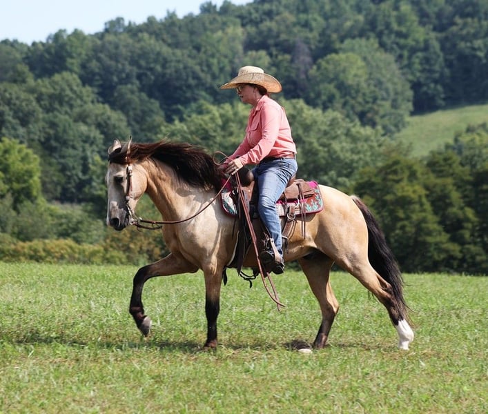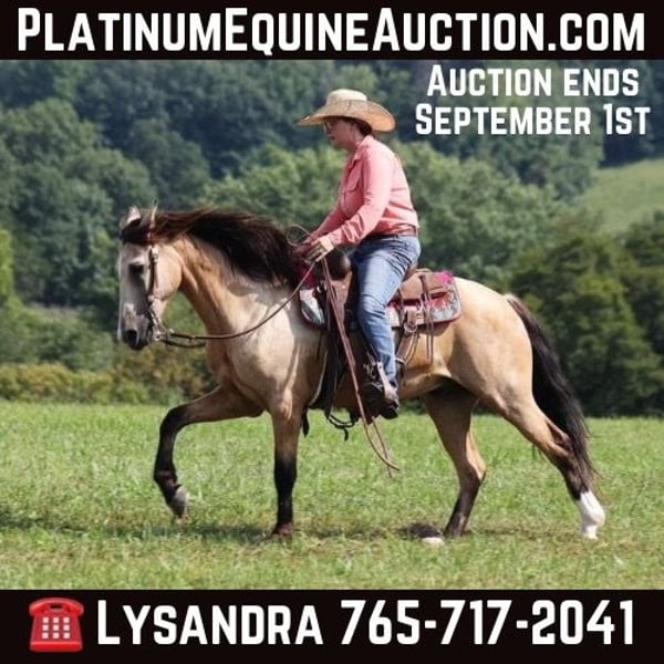 ONLINE AUCTION Place your bids at www.PlatinumEquineAuction.com Starting Bid $3500 Auction ends September 1st, 2024 Need a new saddle? Check out White Rock Saddles on our website or Facebook! Amigo is everyones best friend! And he is not a bad friend to have around… he has a lot of things going for him, such as that beautiful buckskin, coat, that friendly personality, that sweet lope and that big thick mane! He is certainly is a dream come true! Amigo is an 11 year old buckskin quarter horse cross gelding standing around 14.1hh. Amigo has done it all out on the ranch he has pasture roped and doctored sick ones, been hauled to barrel races and rode down the trails! Amigo has been ridden in multiple states from New Mexico to Kentucky. He will cross creeks, ditches, logs and navigate rough rocky areas. He has a nice ground covering walk, smooth jog, a good lope, he reins around anc backs as well! He has been exposed to all kinds of wildlife such as deer or turkey or other animals like cows or dogs and will go anywhere that he is asked too. He has been rode many miles in the mountains of Eastern Kentucky and encountered every obstacle possible on the trail. He will go up or down even the steepest slopes, across deep creeks, over downed trees, and over all types of rough terrain while still being sure footed. If you want to have a good ride and look good on your ride all at the sametime… Amigo is your man!!! Feel free to call Lucky 13 Equine Lysandra 765-717-2041 with any questions. Located in Brodhead, KY. ONLINE AUCTION Place your bids at www.PlatinumEquineAuction.com Starting Bid $3500 Auction ends September 1st, 2024 Need a new saddle? Check out White Rock Saddles on our website or Facebook!