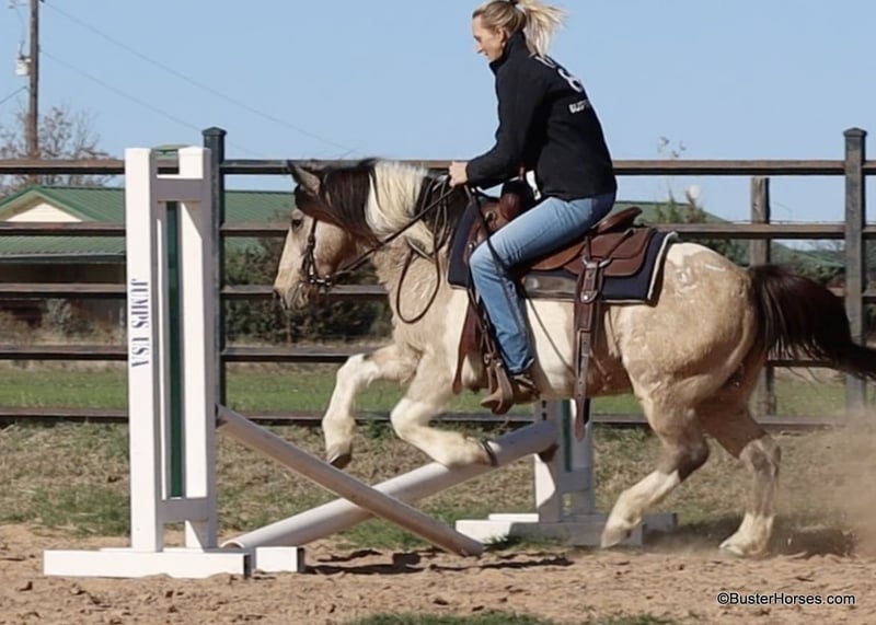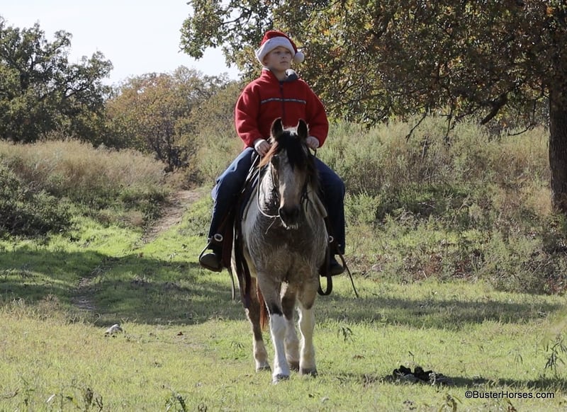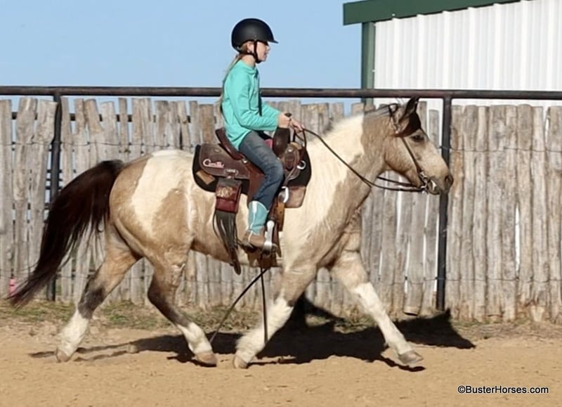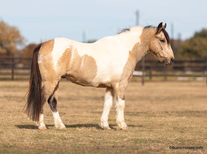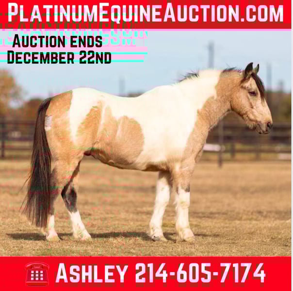 ONLINE AUCTION Place your bids at www.PlatinumEquineAuction.com Starting Bid $3500 Auction ends December 22nd, 2024 Need a new saddle? Check out White Rock Saddles on our website or Facebook! “Teddy Bear” – 13.2H, 12 year old buckskin paint gelding… If you are looking for a sweet, friendly, pleasant little horse who is always there at the gate and ready to go – then check out Teddy’s video! This little horse has been miles and miles in big country, he has checked tons of fences and cows, and he is so pleasant and easy to ride. He has a big walk and can easily keep up with any of the big horses. He will walk out on a big loose rein and travel and get you where you need to go. He is very simple and uncomplicated to ride, he guides well and has a good stop anytime you mention whoa! He has done a little jumping and would make the cutest little entry level dressage or nunter / jumper horse for a little lady, or for a youth rider. Teddy has very smooth gaits – he has an easy little trot and nice comfy lope. He catches both of his leads easily. If you are looking for a fun sized little horse who is big boned and stout enough to tote everyone, but small enough for anyone to ride comfortably and not be intimidated, check out this sweet affectionate little horse. Please call anytime for more information at 214-605-7174 Teddy Bear is located in Weatherford, TX – one hour from Dallas / Fort Worth International Airport. He is an easy day trip or fun overnight trip to come try out, from anywhere! We are experienced knowledgeable sellers and we can help with quickly arranging affordable shipping to any buyer’s location – we have experience shipping horses worldwide – including regularly to Hawaii, Canada, Mexico, Europe, and South Africa. Go to our Facebook page Buster Ranch and check our website for buyer reviews, for more videos, additional info, etc: ONLINE AUCTION Place your bids at www.PlatinumEquineAuction.com Starting Bid $3500 Auction ends December 22nd, 2024 Need a new saddle? Check out White Rock Saddles on our website or Facebook!