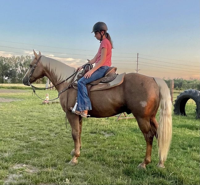 ONLINE AUCTION Place your bids at www.PlatinumEquineAuction.com Starting Bid $3500 Auction ends July 28th, 2024 Need a new saddle? Check out White Rock Saddles on our website or Facebook! Hiatt Chocolena Gold – barn name “Hyatt” he is a 12 year-old registered chocolate Palomino with a white main and tail. He will stand 14.3 hands tall and is a muscular 1200 pounds. He has great confirmation and he has a very pretty head. He is definitely an eye catcher! Hyatt rides with an old-fashioned one hand neck rein. I have used Hyatt in my lesson program for the past year and have had multiple different levels of riders take lessons on him. He has been used in 4H and local horse shows. He excels in disciplines like halter, walk trot, ranch horse, pleasure, and trail class. Hyatt crosses anything on the trail such as ditches, logs, mud puddles, & rocks. Wyatt is also very traffic safe. He has been rode on major highways where there’s tractors, semi’s, motorcycles, four wheelers and bicycles! Hyatt is an excellent overnight camping trail horse. He stands next to the trailer with no problems. He has even been rode next to the train tracks. He is not spooky or shy from different types of terrain. He has been rode in Matzel game reserve around wild life! He has also been ridden in large bodies of water, like rivers and lakes. He has been trail ridden in Palo Duro Canyon by an 11-year-old girl. He is very surefooted! Hyatt has also been around cattle. Hyatt’s ground manners are impeccable and he stands like a statue for the Farrier and to saddle, mount and dismount. He trailers well and he is broke to hobble on a picket line! He loads and unloads in any type of trailer with no hesitation ! Hyatt is one of the easiest horses to catch. He loves to be bathed brushed and picks up his feet automatically. He is 100% sound in every way mind, body and spirit. He loves attention and he is good in a stall or in pasture.! Hyatt has no bad habits like cribbing, weaving or pacing. He is a true all around family horse for everyone to ride and enjoy. We have also used Hyatt to break young Colts and to Pony/exercise our older horses, tons of videos and pictures available. Located in Lisbon, IA. Contact John McPhail 319-721-7714 with any questions. ONLINE AUCTION Place your bids at www.PlatinumEquineAuction.com Starting Bid $3500 Auction ends July 28th, 2024 Need a new saddle? Check out White Rock Saddles on our website or Facebook!
