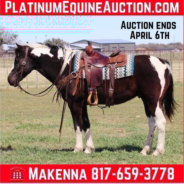 ONLINE AUCTION Place your bids at www.PlatinumEquineAuction.com Starting Bid $3500 Auction ends April 6th, 2025 Need a new saddle? Check out White Rock Saddles on our website or Facebook! Peter is a super sweet gelding, standing at 14.3hh tall. He is the perfect size and absolutely safe for the whole family! Peter is a great trail horse, point and go type. Crosses over and through anything you ask of him, goes right into water, and can go out alone or in a group! He is so laid back and calm in everything you do with him. Pete is a puppy dog and doesn’t have a care in the world about anything! Let the kids go have fun on this guy, or just enjoy him for yourself! Pete has plenty of life left in him, at just 13 years old, he will last for many years in to come! Peter is a quarter horse cross, and does have some gait to him, but only if you ask for it! We absolutely encourage any one to come try and see how great he is for yourselves but we are also able to arrange shipping anywhere from Hawaii to Canada and any state in the U.S. He is located in Lipan, TX. Please Call or text Makenna Hartzell 817-659-3778 for more information. ONLINE AUCTION Place your bids at www.PlatinumEquineAuction.com Starting Bid $3500 Auction ends April 6th, 2025 Need a new saddle? Check out White Rock Saddles on our website or Facebook!
