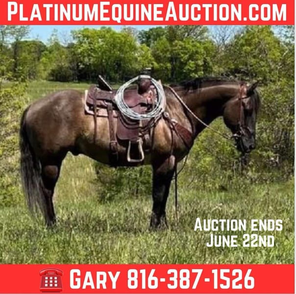 ONLINE AUCTION Place your bids at www.PlatinumEquineAuction.com Starting Bid $3500 Auction ends June 22nd, 2025 Need a new saddle? Check out White Rock Saddles on our website or Facebook! This is “DRIFTWOODSBRODYBOY”, a 15hh, 2012 AQHA registered GRULLA gelding that is a seasoned ranch horse, trail horse, and a qualified family horse. He has had reining training when younger and been used for ranch pleasure. He’s thick made and he will ride around when asked to do so, he’s been ranching in Montana and has lots of outside miles behind cattle. He has been pasture roping, used to load out trucks, and to sort pairs. He will one-hand neck rein and if asked to do so he will sit down and turn around nicely. He will slide stop, one-step lope, and catch his leads. He will lope nice circles in and out of the arena. This gelding is very gentle, he stays gentle even with time off, and he can be ridden by any level rider. He stays relaxed, calm, cool, and collected even in new and unpredictable situations. He will unload off the trailer in unfamiliar territory and ride off with no silliness. He is low-headed and rides obedient and always attentive to his riders cues. He crosses water without hesitation, he will go up and down very steep hills, and he can handle rocky and shifty terrain with no problems. He’s sure-footed and knows what to do in the rough country. He will ride out alone bravely and will also go in a group in the front or the rear. He has excellent ground manners, he’s super to work around, he likes attention, and he knows a full days work. He’s 15 hands tall and he is 13 years old. He’s attractive, shapey, has the cowboy color, the best personality, the training, and the ride to make his new owners so proud. He has been hauled to local jackpots and is ready to go to more. He is one cool horse that is user-friendly. Located in Union Star, MO. Contact Gary Osborn 816-387-1526. ONLINE AUCTION Place your bids at www.PlatinumEquineAuction.com Starting Bid $3500 Auction ends June 22nd, 2025 Need a new saddle? Check out White Rock Saddles on our website or Facebook!